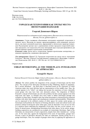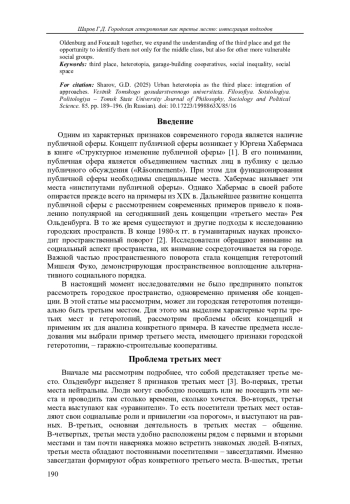 Статья посвящена обоснованию интеграции концепций гетеротопии и третьего места. Несмотря на хорошо зарекомендовавшую себя концепцию третьего места, она имеет ключевой недостаток, выраженный в элитистском характере концепции. Рассмотрение третьих мест с применением оптики городских гетеротопий позволяет преодолеть этот недостаток. В статье интеграция двух подходов применяется для анализа примера гаражно-строительных кооперативов.