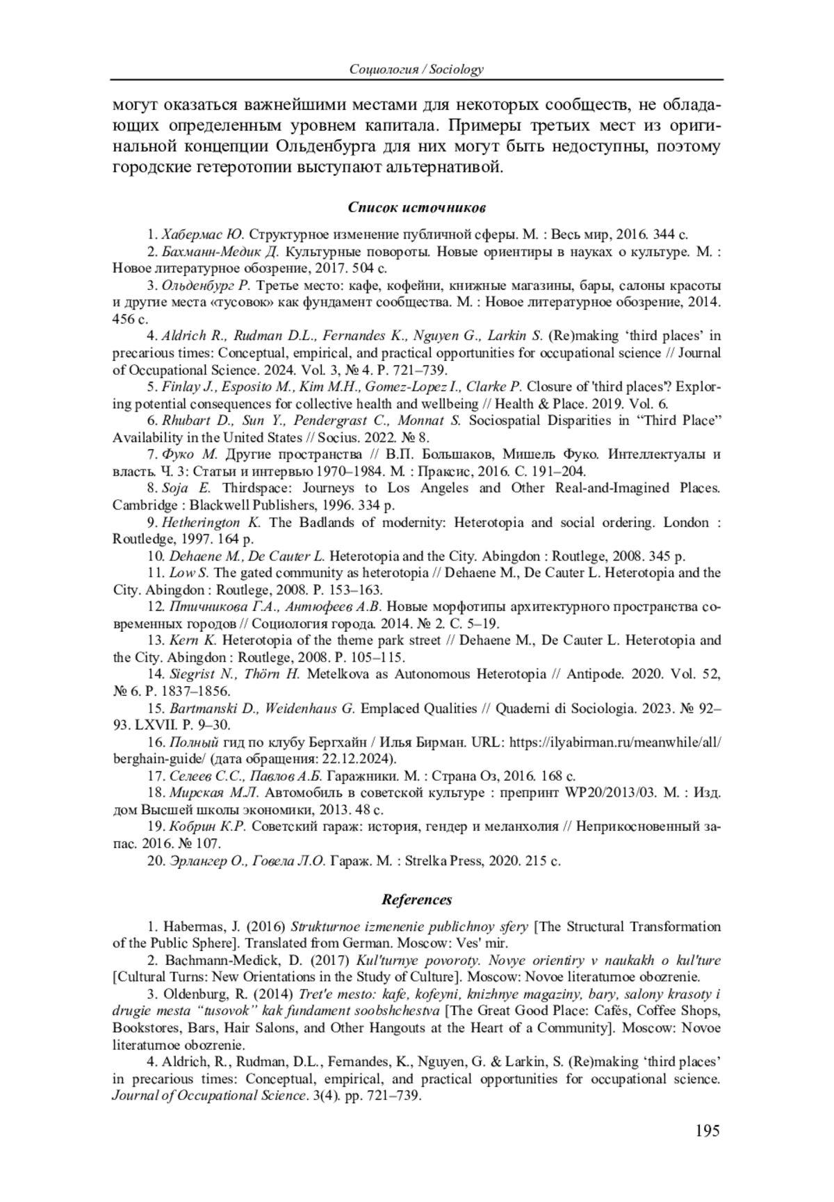 4. Aldrich R., Rudman D.L., Fernandes K., Nguyen G., Larkin S. (Re)making ‘third places’ in precarious times: Conceptual, empirical, and practical opportunities for occupational science // Journal of Occupational Science. 2024. Vol. 3, № 4. P. 721-739.