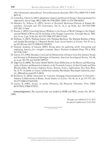 24. Шматко Н., Волкова Г. Служба или служение? Мотивационные паттерны российских учёных // Форсайт. Т. 11. № 2. C. 54-66. DOI: 10.17323/2500-2597.2017.1.54.66 EDN: YZMHRJ