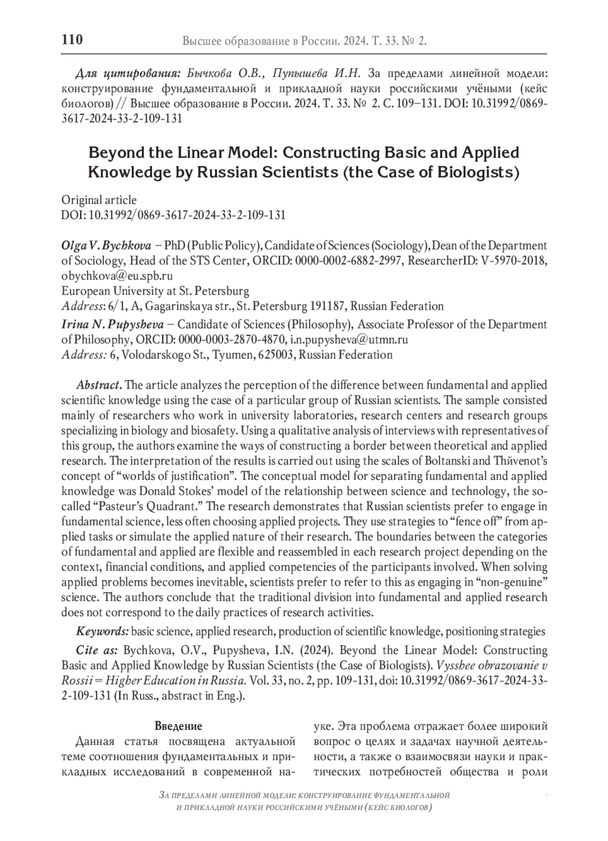 В научной литературе активно обсуждаются способы конструирования разделения на «фундаментальное» и «прикладное», как и факторы последующего выбора между ними в повседневной работе исследователей. Задача нашей статьи – проанализировать разделение фундаментального и прикладного научного знания и провести границу между теоретическими и прикладными исследованиями в российском контексте на примере отдельной группы исследователей. Вопросы, на которых мы сфокусируемся, касаются обоснования выбора (фундаментального знания против прикладного) и позиционирования своего выбора российскими исследователями в различных грантовых и проектных заявках.