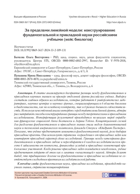 В статье анализируется восприятие разницы между фундаментальным и прикладным научным знанием на примере отдельной группы российских учёных. Выборку составили главным образом исследователи, которые работают в университетских лабораториях, научных центрах и научных группах, специализирующихся в области биологии и биобезопасности, как по основному контракту, так и в рамках внешнего совместительства. Используя качественный анализ интервью с представителями данной группы, авторы рассматривают способы конструирования границы между теоретическими и прикладными исследованиями. Интерпретация результатов производится по шкалам миров оправдания французских социологов Люка Болтански и Лорана Тевено. Концептуальной схемой для разделения фундаментального и прикладного знания стала модель взаимоотношений науки и технологий американского политолога Дональда Стоукса «Квадрант Пастера». Показано, что учёные предпочитают заниматься фундаментальной наукой, реже выбирая прикладные проекты. Они используют стратегии «ограждения» от прикладных задач или имитируют прикладной характер своих исследований. Границы между категориями фундаментального и прикладного гибкие и пересобираются в каждом исследовательском проекте в зависимости от контекста, финансовых условий и прикладных компетенций привлекаемых участников. Когда решение прикладных задач оказывается неизбежным, учёные предпочитают говорить об этом как о занятии «ненастоящей» наукой. Авторы делают вывод, что традиционное деление на фундаментальные и прикладные исследования не соответствует ежедневным практикам исследовательской работы.