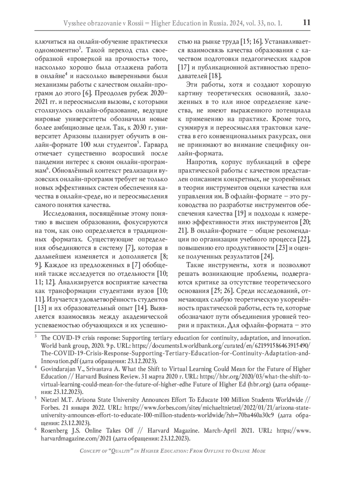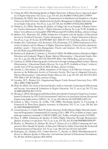 10. Cheng M. Quality as transformation: educational metamorphosis // Quality in Higher Education. 2014. Vol. 20. No. 3. P. 272-289. DOI: 10.1080/13538322.2014.978135