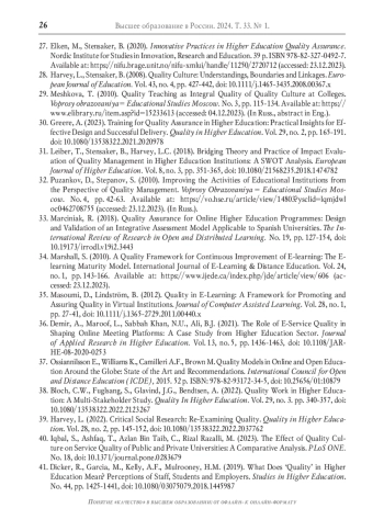 33. Marciniak R. Quality Assurance for Online Higher Education Programmes: Design and Validation of an Integrative Assessment Model Applicable to Spanish Universities // The International Review of Research in Open and Distributed Learning. 2018. No. 19. P. 127-154. DOI: 10.19173/irrodl.v19i2.3443