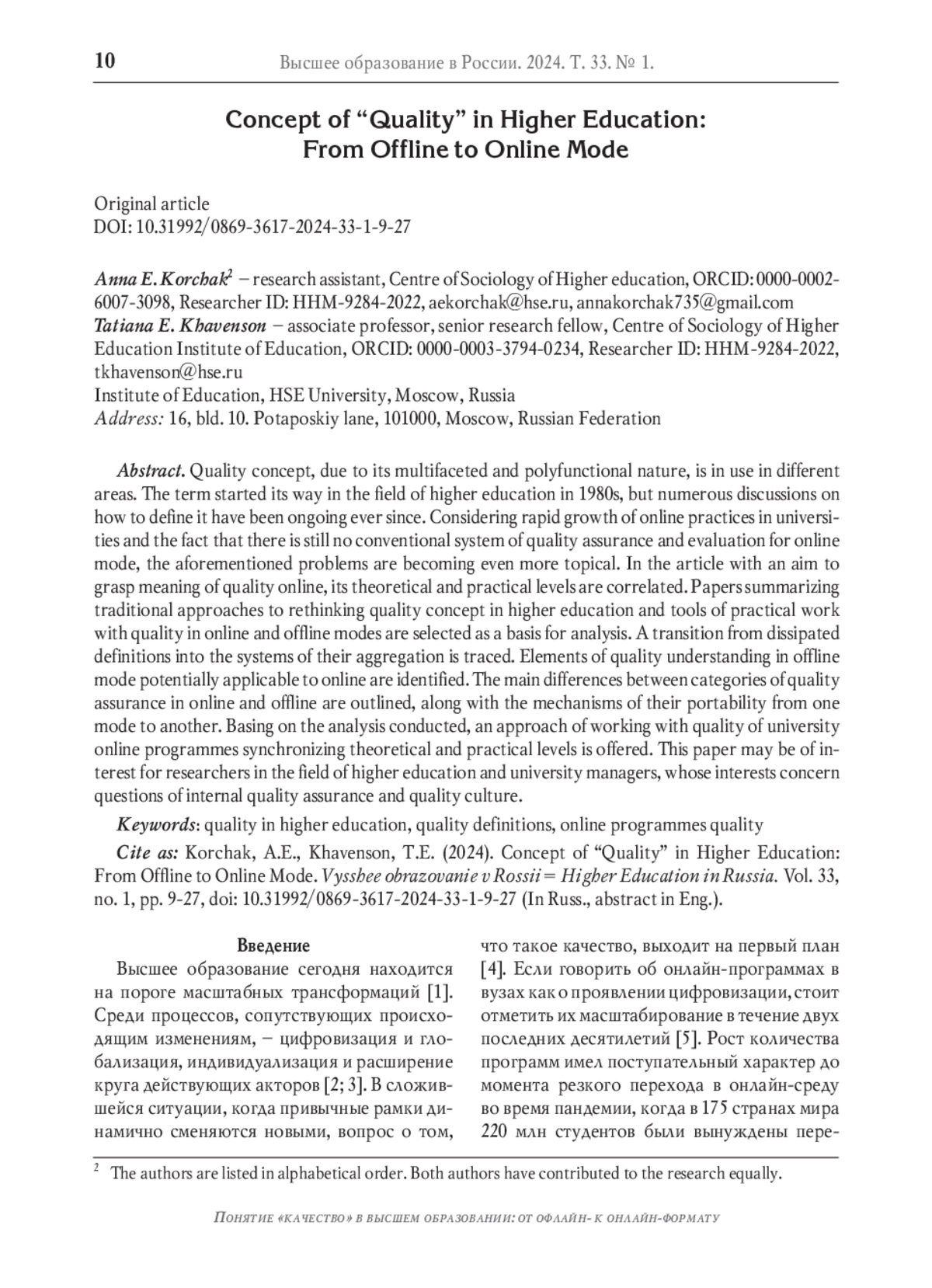 Понятие «качество», в силу своей многогранности и полифункциональности, используется в различных сферах деятельности. В сферу высшего образования термин пршёл в 80-е гг. XX века, но дискуссии о том, как его определять, не утихают по сей день. Учитывая масштабирование онлайн-практик на университетских программах и отсутствие единой системы обеспечения и оценивания качества в онлайн-формате, вышеназванные проблемы проявляются ещё более ярко. В статье с целью выявить смысловое наполнение понятия «качество» в онлайн-среде сопоставляются теоретический и практический уровни его функционирования в двух форматах. Основой для исследования служат работы, посвящённые обобщению традиционных подходов к переосмыслению понятия качества в высшем образовании и инструментов работы с ним в онлайн- и офлайн-среде. Прослеживается движение от разрозненных определений качества к системам их обобщения. Выявляется, какие элементы понимания качества в офлайн-формате являются потенциально применимыми в онлайн-формате. Определяются основные различия между категориями обеспечения качества в онлайн- и офлайн-форматах, выявляется их преемственность. На основе проведённого анализа предложен подход к работе с качеством вузовских онлайн-программ, объединяющий теорию и практику. Работа представляет интерес для исследователей в сфере высшего образования, а также для вузовских управленцев, заинтересованных в вопросах внутренних практик работы с качеством и культуры качества.