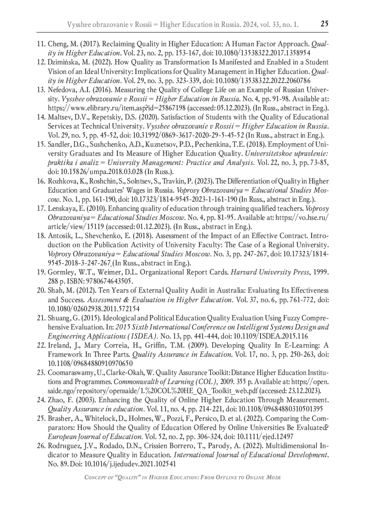 11. Cheng M. Reclaiming quality in higher education: a human factor approach // Quality in Higher Education. 2017. Vol. 23. No. 2. P. 153-167. DOI: 10.1080/13538322.2017.1358954