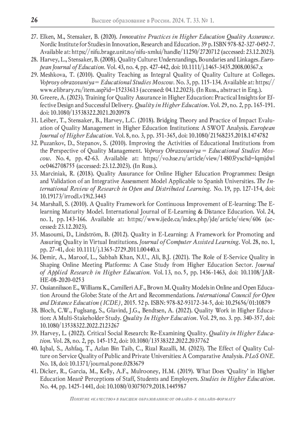 27. Elken M., Stensaker B. Innovative practices in higher education quality assurance. Nordic Institute for Studies in Innovation, Research and Education, 2020. 39 p. URL: https://nifu.brage.unit.no/nifu-xmlui/handle/11250/2720712 (дата обращения: 23.12.2023).