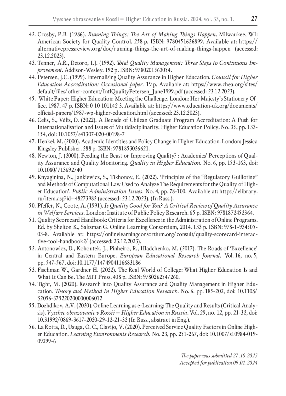 44. Petersen J.C. Internalising quality assurance in higher education / Council for Higher Education Accreditation: Occasional paper, 1999. 19 p. URL: https://www.chea.org/sites/default/files/other-content/IntlQualityPetersen_June1999.pdf (дата обращения: 23.12.2023).