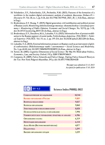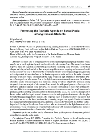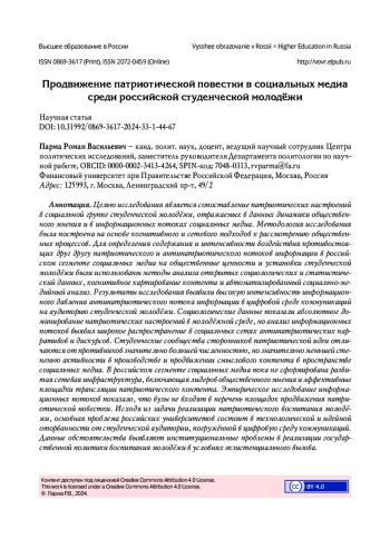 Целью исследования является сопоставление патриотических настроений в социальной группе студенческой молодёжи, отражаемых в данных динамики общественного мнения и в информационных потоках социальных медиа. Методология исследования была построена на основе когнитивного и сетевого подходов к рассмотрению общественных процессов. Для определения содержания и интенсивности воздействия противостоящих друг другу патриотического и антипатриотического потоков информации в российском сегменте социальных медиа на общественные ценности и установки студенческой молодёжи были использованы методы анализа открытых социологических и статистический данных, когнитивное картирование контента и автоматизированный социально-медийный анализ. Результаты исследования выявили высокую интенсивность информационного давления антипатриотического потока информации в цифровой среде коммуникаций на аудиторию студенческой молодёжи. Социологические данные показали абсолютное доминирование патриотических настроений в молодёжной среде, но анализ информационных потоков выявил широкое распространение в социальных сетях антипатриотических нарративов и дискурсов. Студенческие сообщества сторонников патриотической идеи отличаются от противников значительно большей численностью, но значительно меньшей степенью активности в производстве и продвижении смыслового контента в пространстве социальных медиа. В российском сегменте социальных медиа пока не сформирована развитая сетевая инфраструктура, включающая лидеров общественного мнения и эффективные площадки трансляции патриотического контента. Эмпирическое исследование информационных потоков показало, что вузы не входят в перечень площадок продвижения патриотической повестки. Исходя из задачи реализации патриотического воспитания молодёжи, основная проблема российских университетов состоит в технологической и идейной оторванности от студенческой аудитории, погружённой в цифровую среду коммуникаций. Данные обстоятельства выявляют институциональные проблемы в реализации государственной политики воспитания молодёжи в условиях экзистенциального вызова.