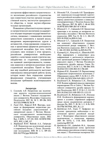 1. Селезнева А.В. Патриотизм как политическая ценность: политико-психологический анализ // Вестник Томского государственного университета. Философия. Социология. Политология. 2017. № 38. С. 205-206. DOI: 10.17223/1998863X/38/20 EDN: ZBBDOF