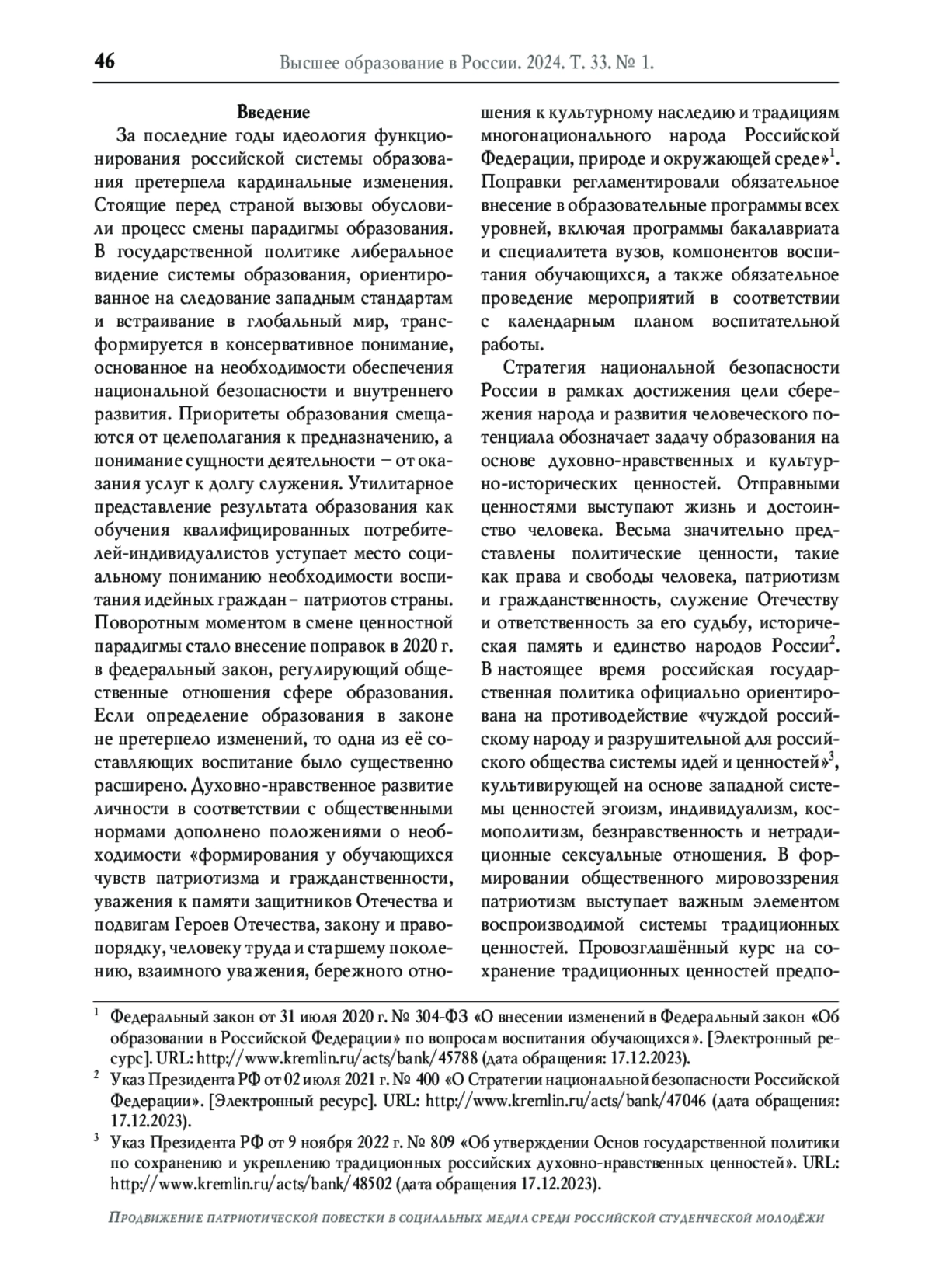 За последние годы идеология функционирования российской системы образования претерпела кардинальные изменения. Стоящие перед страной вызовы обусловили процесс смены парадигмы образования. В государственной политике либеральное видение системы образования, ориентированное на следование западным стандартам и встраивание в глобальный мир, трансформируется в консервативное понимание, основанное на необходимости обеспечения национальной безопасности и внутреннего развития.