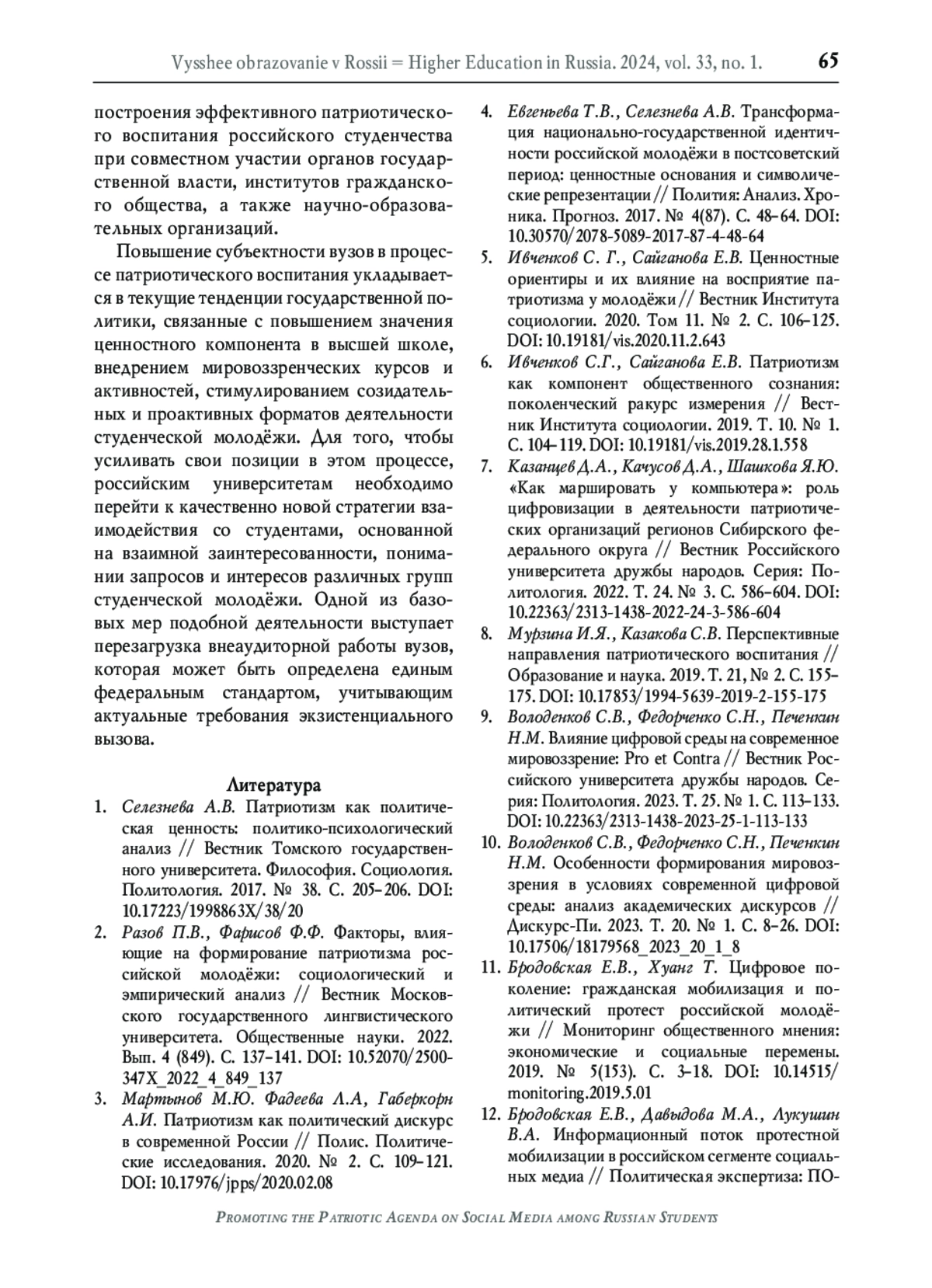 5. Ивченков С.Г., Сайганова Е.В. Ценностные ориентиры и их влияние на восприятие патриотизма у молодёжи // Вестник Института социологии. 2020. Том 11. № 2. C. 106-125. DOI: 10.19181/vis.2020.11.2.643 EDN: VJNDIM