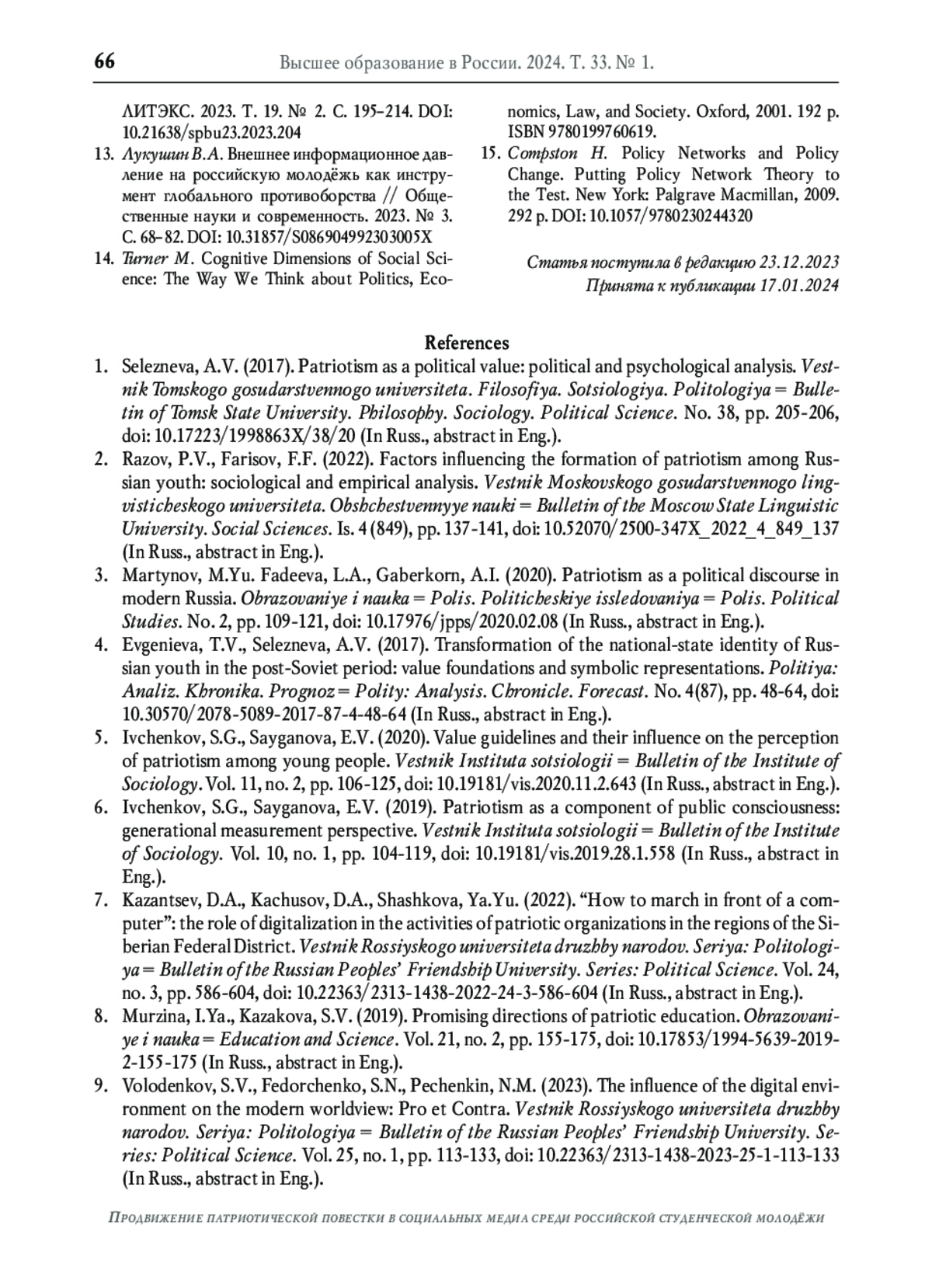 2. Разов П.В., Фарисов Ф.Ф. Факторы, влияющие на формирование патриотизма российской молодёжи: социологический и эмпирический анализ // Вестник Московского государственного лингвистического университета. Общественные науки. 2022. Вып. 4 (849). C. 137-141. DOI: 10.52070/2500-347X_2022_4_849_137 EDN: HCWZID