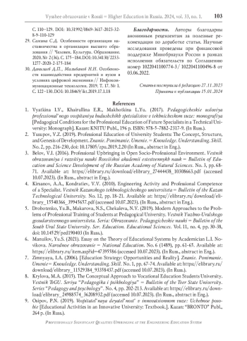 5. Дроботенко Ю.Б., Макарова Н.С., Чекалева Н.В. Современные подходы к проблемам профессионального воспитания студентов педагогического вуза // Вестник ЮУрГУ. Серия “Образование. Педагогические науки”. 2019. Т. 11. № 4. С. 30-38. DOI: 10.14529/ped190403 EDN: MLFGBK