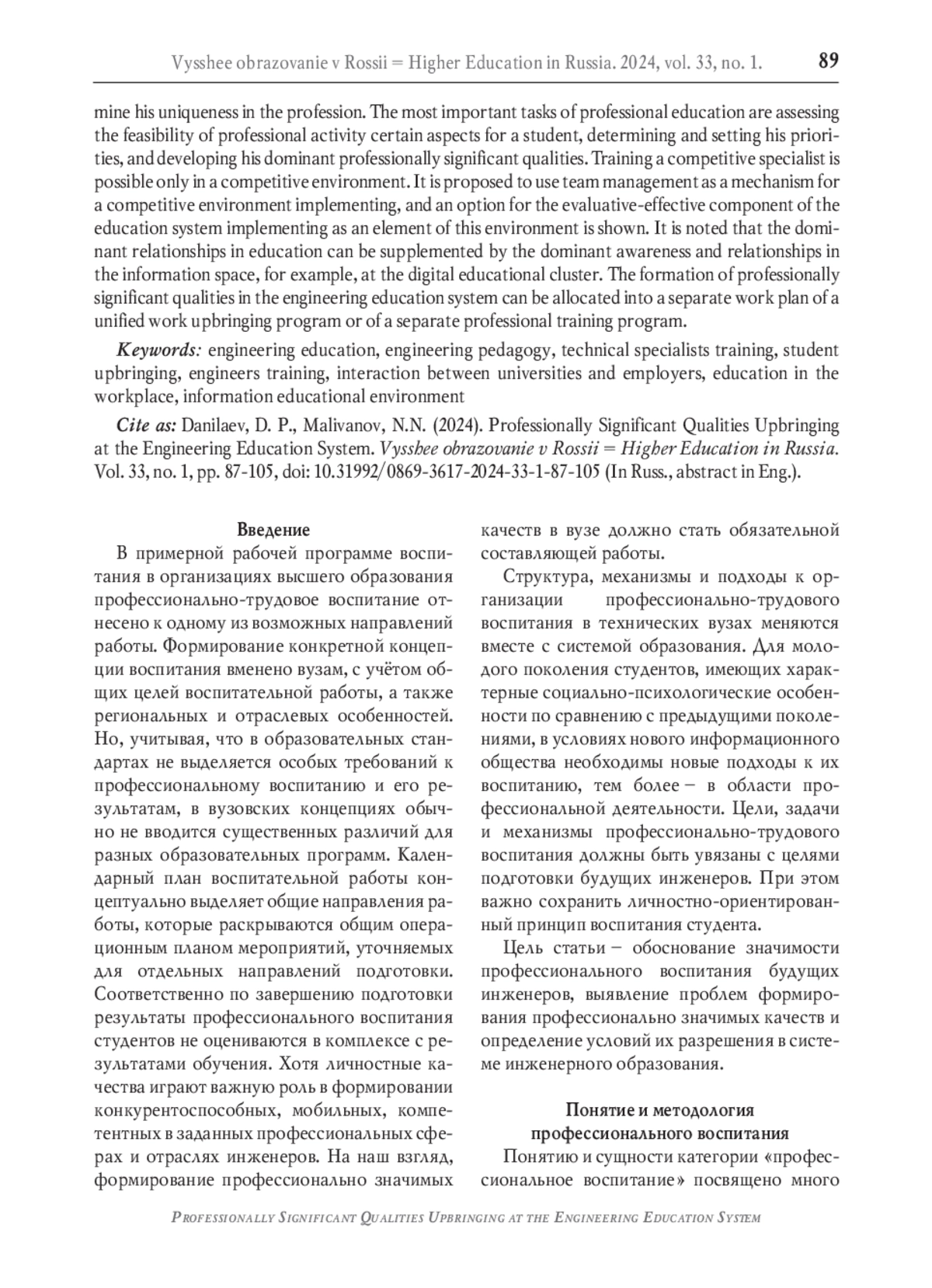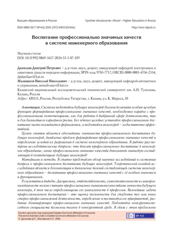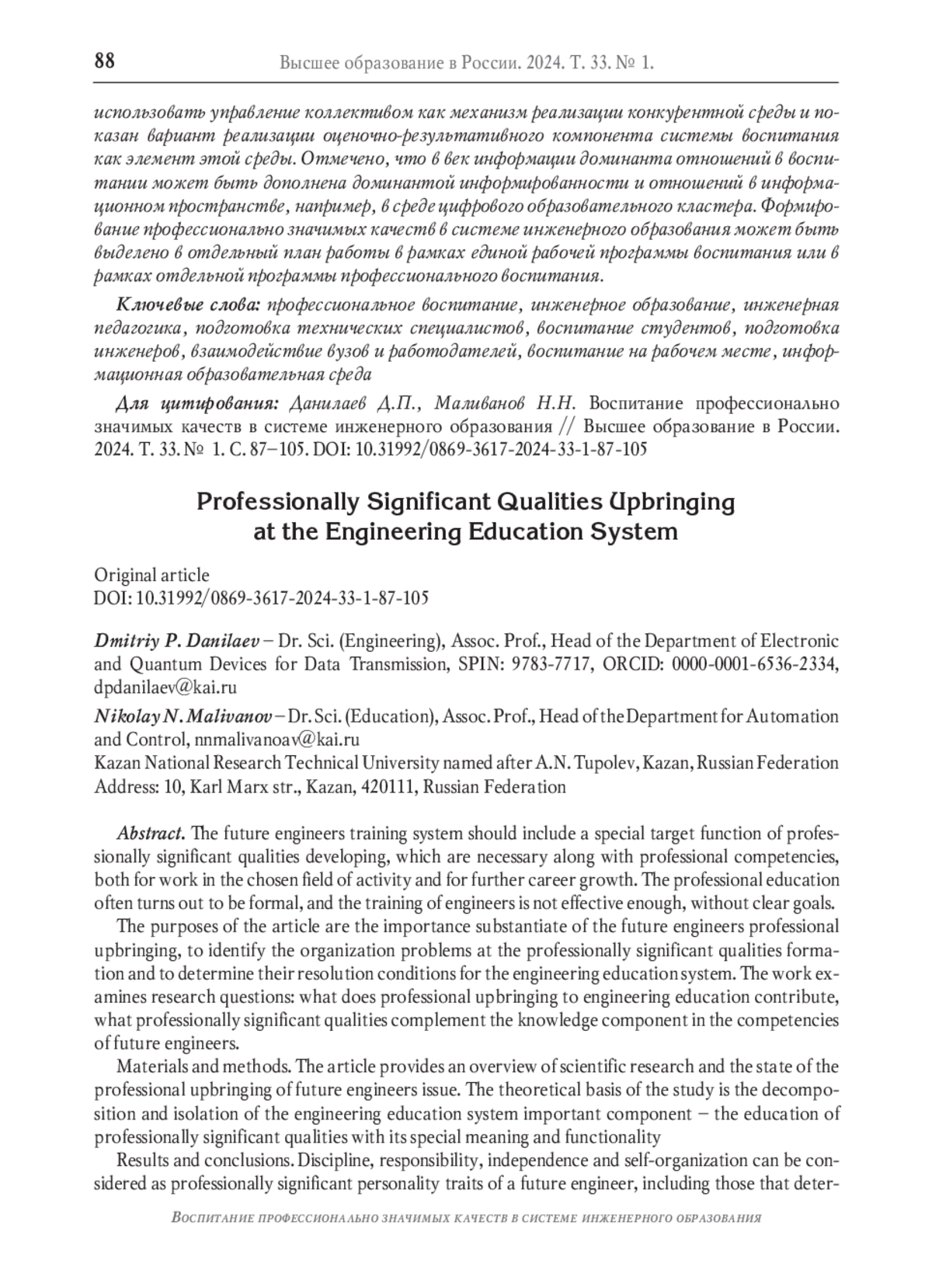 Система подготовки будущих инженеров должна включать особую целевую функцию формирования профессионально значимых качеств, необходимых наравне с профессиональными компетенциями, как для работы в выбранной сфере деятельности, так и для дальнейшего карьерного роста. Без чётких целевых установок профессиональное воспитание часто оказывается формальным, а подготовка инженеров - недостаточно эффективной. Целью статьи является обоснование значимости профессионального воспитания будущих инженеров, выявление проблем формирования профессионально значимых качеств и определение условий их разрешения в системе инженерного образования. В работе рассмотрены исследовательские вопросы: что вносит профессиональное воспитание в инженерное образование, какие профессионально значимые качества дополняют знаниевую составляющую в компетенциях будущих инженеров? Материалы и методы. В статье представлен обзор научных исследований и состояния вопроса о профессиональном воспитании будущих инженеров. Теоретической основой исследования является декомпозиция и вычленение важной составляющей системы инженерного образования - воспитания профессионально значимых качеств с её особым значением и функционалом. Результаты и выводы. Дисциплину, ответственность, самостоятельность и самоорганизованность можно считать профессионально значимыми качествами личности будущего инженера, в том числе определяющими его уникальность в профессии. Важнейшие задачи профессионального воспитания - это оценка посильности для студента тех или иных сторон профессиональной деятельности, определение и постановка его приоритетов, развитие доминирующих профессионально значимых качеств. Подготовка конкурентоспособного специалиста возможна только в конкурентной среде. В связи с этим предложено использовать управление коллективом как механизм реализации конкурентной среды и показан вариант реализации оценочно-результативного компонента системы воспитания как элемент этой среды. Отмечено, что в век информации доминанта отношений в воспитании может быть дополнена доминантой информированности и отношений в информационном пространстве, например, в среде цифрового образовательного кластера. Формирование профессионально значимых качеств в системе инженерного образования может быть выделено в отдельный план работы в рамках единой рабочей программы воспитания или в рамках отдельной программы профессионального воспитания.