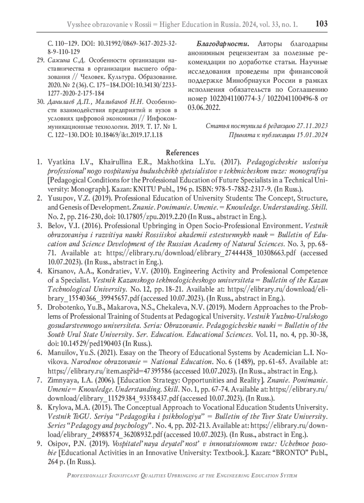 13. Тома Ж.В., Пашин А.А. Профессиональное воспитание студентов в условиях вузовской среды // Современные наукоёмкие технологии. 2022. № 3. С. 186-190. EDN: GHGAKO