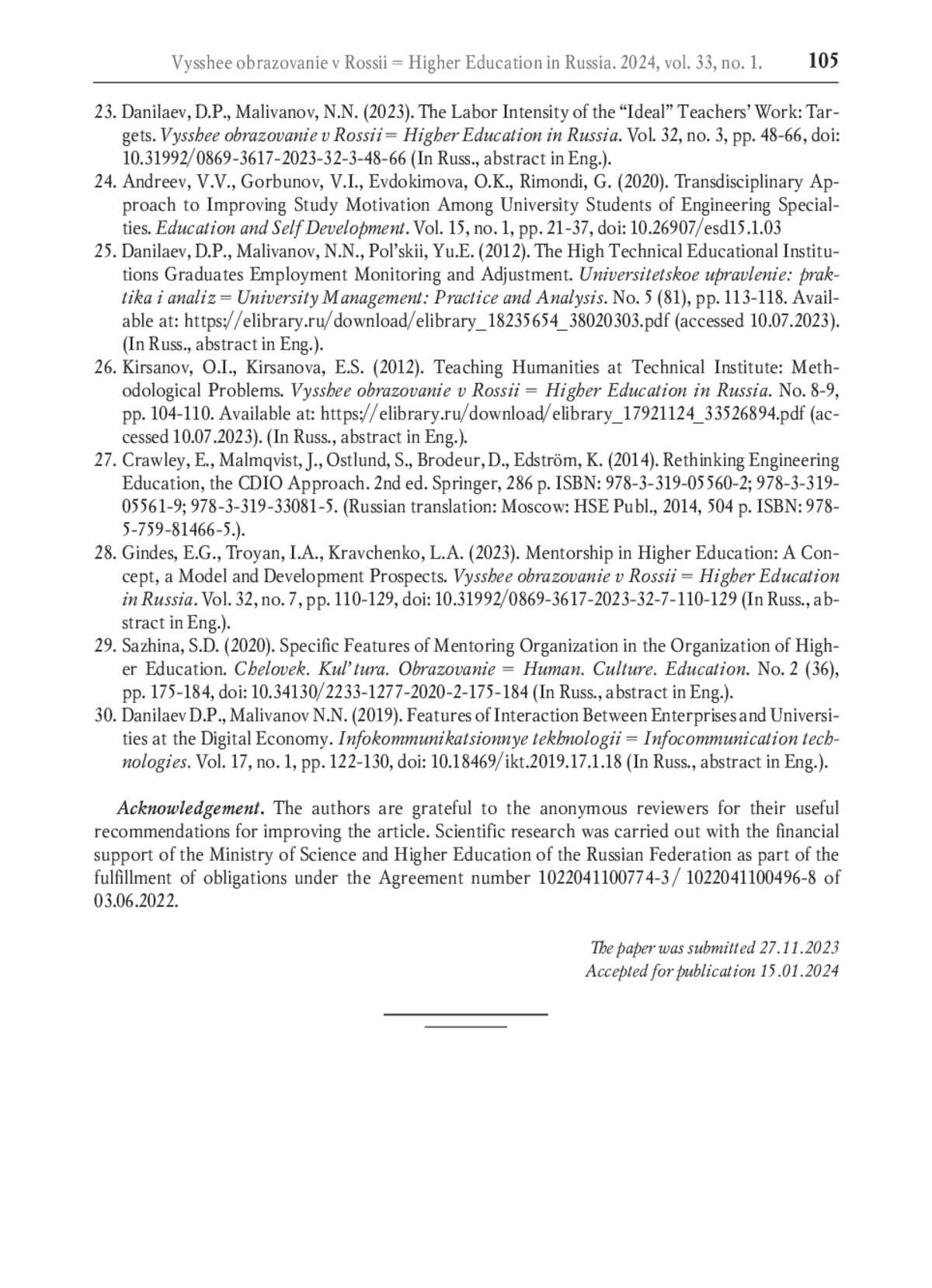 23. Данилаев Д.П., Маливанов Н.Н. Функционал преподавателя технического вуза: целевые ориентиры // Высшее образование в России. 2023. Т. 32. № 3. С. 48-66. DOI: 10.31992/0869-3617-2023-32-3-48-66 EDN: WQEHPQ