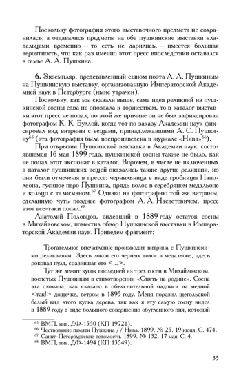 В статье рассматривается история создания и бытования пушкинских реликвий - фрагментов третьей сосны из Михайловского, воспетой поэтом в стихотворении «Вновь я посетил…». Восстанавливается хронология превращения остатков сосны в мемориальный предмет, затем - в пресс-папье, заказанные Г. А. Пушкиным к 100-летнему юбилею А. С. Пушкина. В 1837 году А. И. Тургенев, говоря о пушкинских соснах, предсказал, что они «для русских будут то же, что дерево Тасса над Ватиканом в Италии и для всей Европы». Именно после того, как в Риме у остатков дуба, в тени которого отдыхал итальянский поэт, была установлена памятная доска, Г. А. Пушкин решил спасти остатки пушкинской сосны и спилил их. В начале 1899 года он подарил наиболее массивную часть сосны Пушкинскому музею Царскосельского лицея, а затем изготовил из оставшихся частей несколько пресс-папье, история которых восстанавливается в статье по рукописным и печатным источникам. Впервые описано пресс-папье, которое принадлежало Г. А. Пушкину и ныне хранится в частном собрании (Франция).