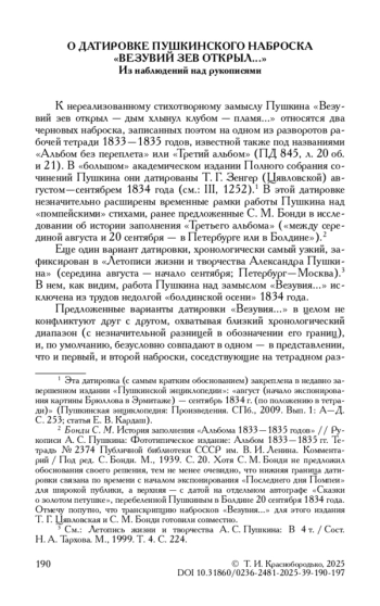 В статье на основании палеографического и текстологического изучения двух черновых автографов стихотворного наброска «Везувий зев открыл - дым хлынул клубом - пламя…» уточняется хронология работы над этим незавершенным пушкинским замыслом, в котором отразились первые впечатления поэта от грандиозного исторического полотна К. П. Брюллова. Для уточнения существующих в пушкиноведении датировок «Везувия…» привлечен широкий автографический и биографический контекст.