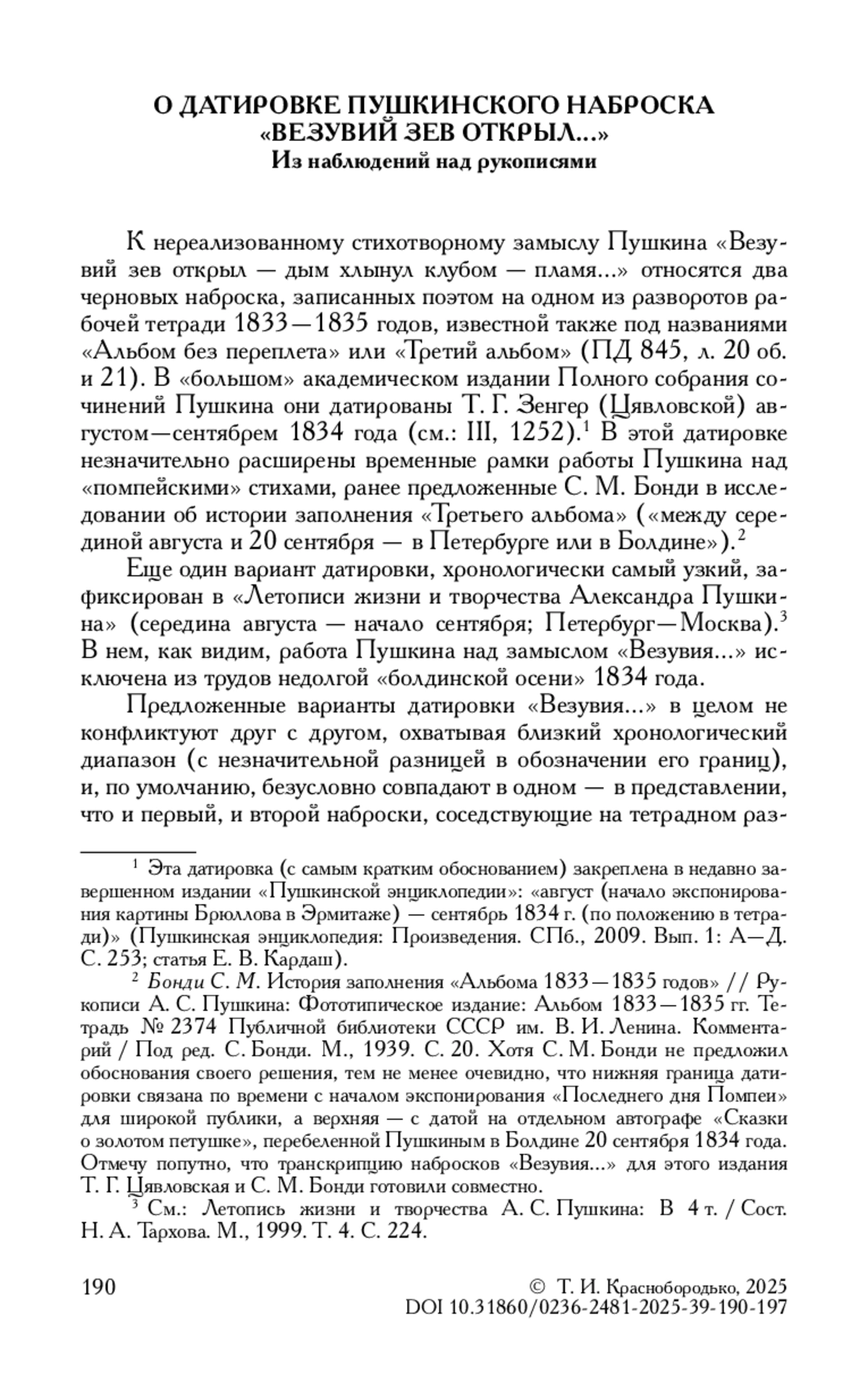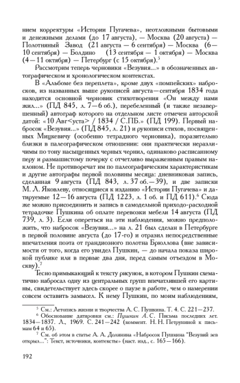 К нереализованному стихотворному замыслу Пушкина «Везувий зев открыл — дым хлынул клубом — пламя…» относятся два черновых наброска, записанных поэтом на одном из разворотов рабочей тетради 1833—1835 годов, известной также под названиями «Альбом без переплета» или «Третий альбом» (ПД 845, л. 20 об. и 21). В «большом» академическом издании Полного собрания сочинений Пушкина они датированы Т. Г. Зенгер (Цявловской) августом—сентябрем 1834 года (см.: III, 1252).1 В этой датировке незначительно расширены временные рамки работы Пушкина над «помпейскими» стихами, ранее предложенные С. М. Бонди в исследовании об истории заполнения «Третьего альбома» («между серединой августа и 20 сентября — в Петербурге или в Болдине»).2