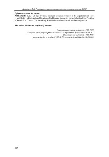 12. Лагутина М.Л., Михайленко Е.Б. Регионализм в глобальную эпоху: обзор зарубежных и российских подходов // Вестник Российского университета дружбы народов. Серия: Международные отношения. 2020. Т. 20, № 2. С. 261-278. DOI: 10.22363/2313-0660-2020-20-2-261-278 EDN: OSHXSJ