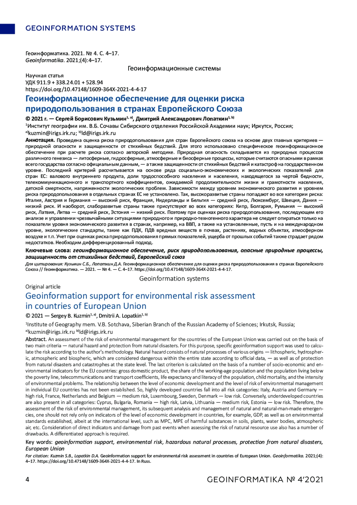 8. Кузьмин С.Б. Оценка риска хозяйственной деятельности в условиях стихийных бедствий по странам мира // Известия РАН. Серия географическая. - 2007. - № 4. - С. 86-96.
