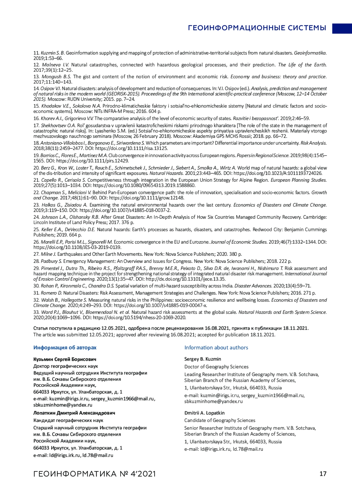 11. Кузьмин C.Б. Геоинформационное обеспечение и картографирование защищенности административно-территориальных субъектов от стихийных бедствий // Геоинформатика. - 2019. - № 1. - С. 53-66.