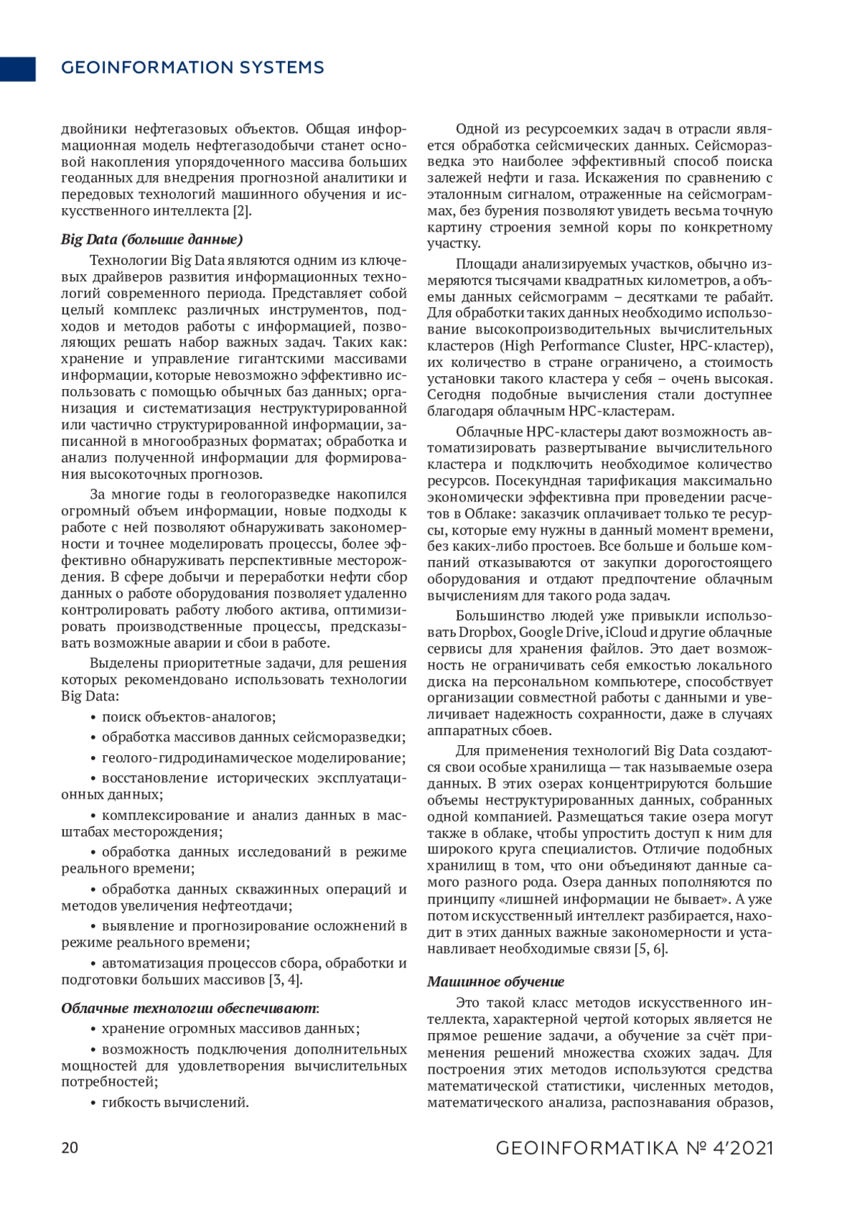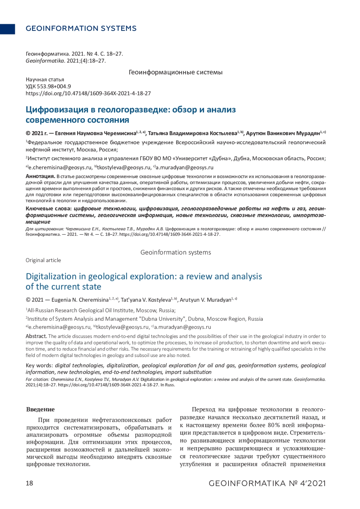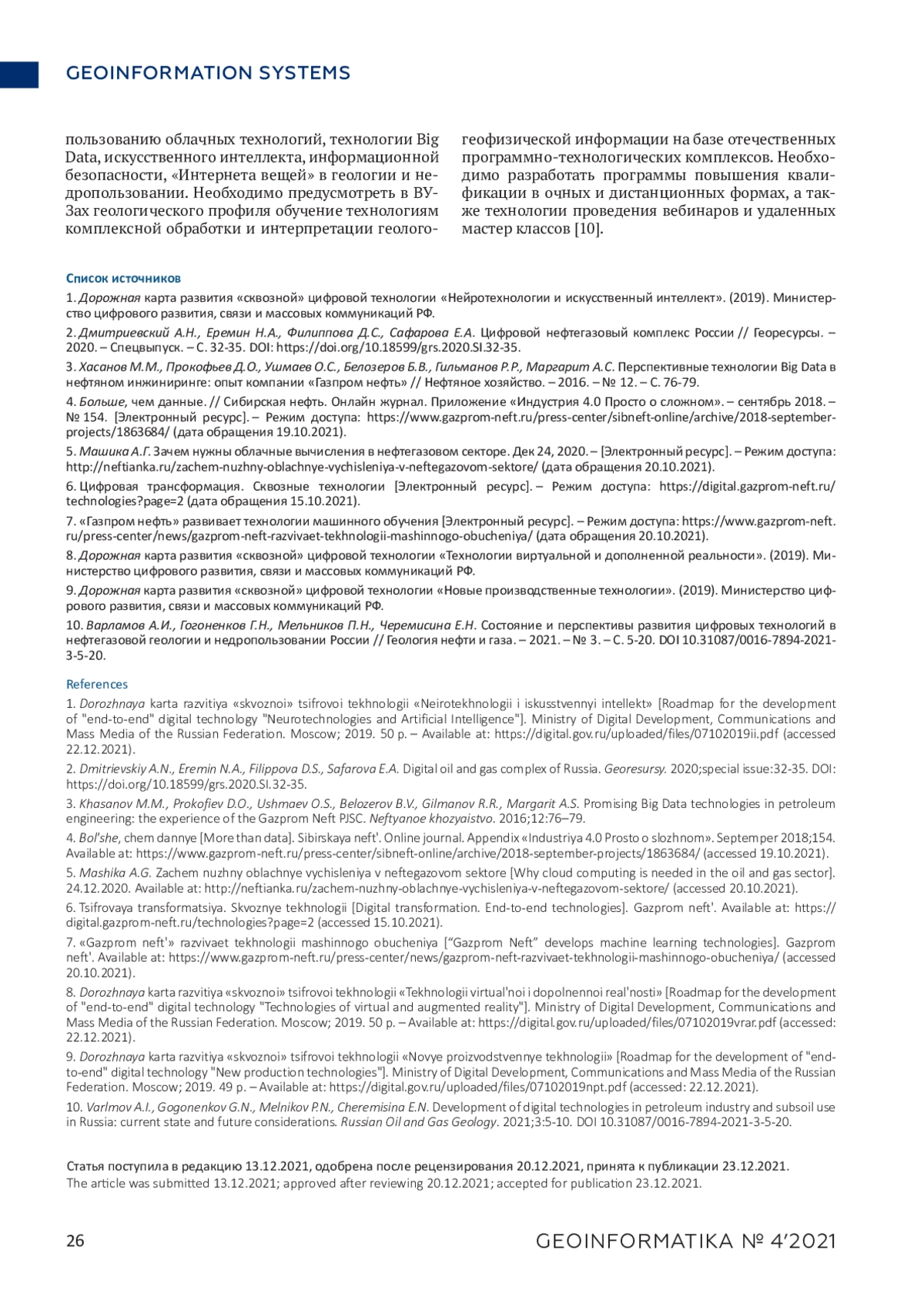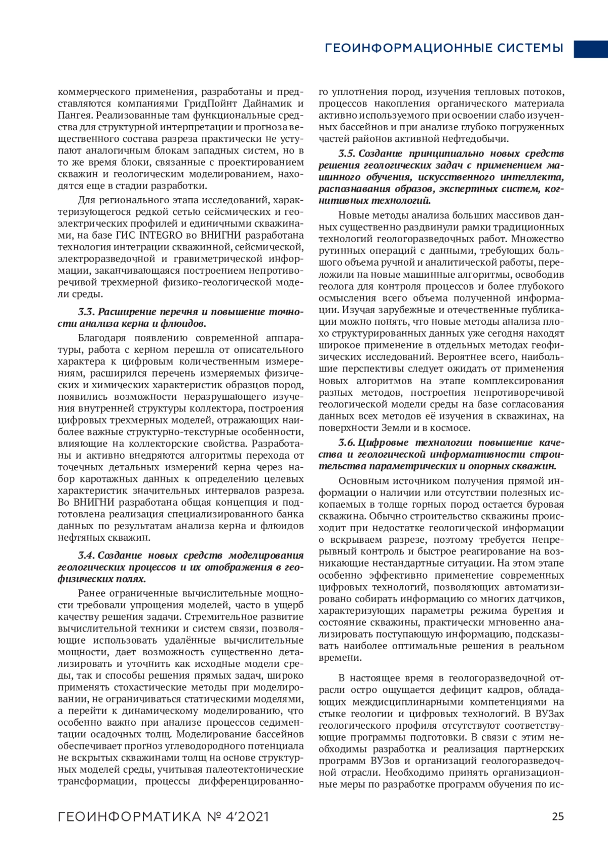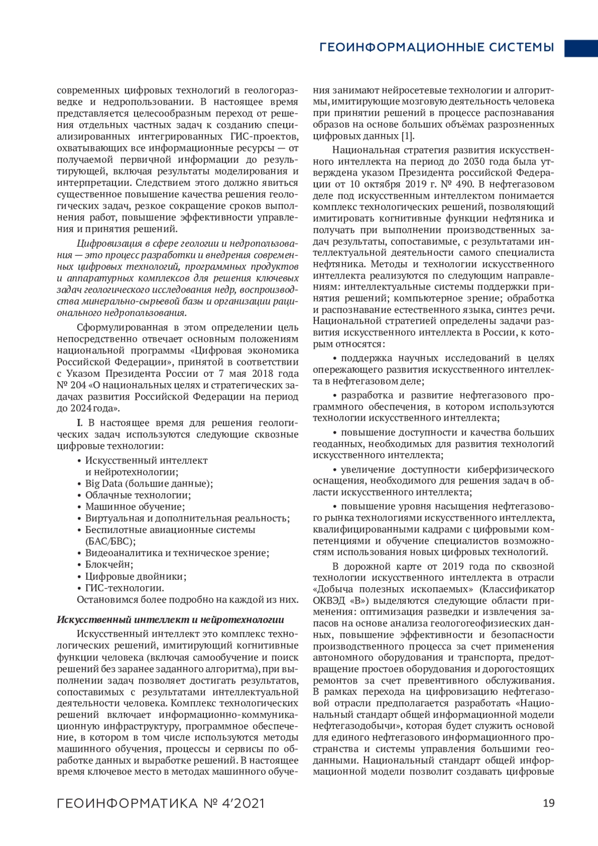 В статье рассмотрены современные сквозные цифровые технологии и возможности их использования в геологоразведочной отрасли для улучшения качества данных, оперативной работы, оптимизации процессов, увеличения добычи нефти, сокращения времени выполнения работ и простоев, снижения финансовых и других рисков. А также отмечены необходимые требования для подготовки или переподготовки высококвалифицированных специалистов в области использования современных цифровых технологий в геологии и недропользовании.