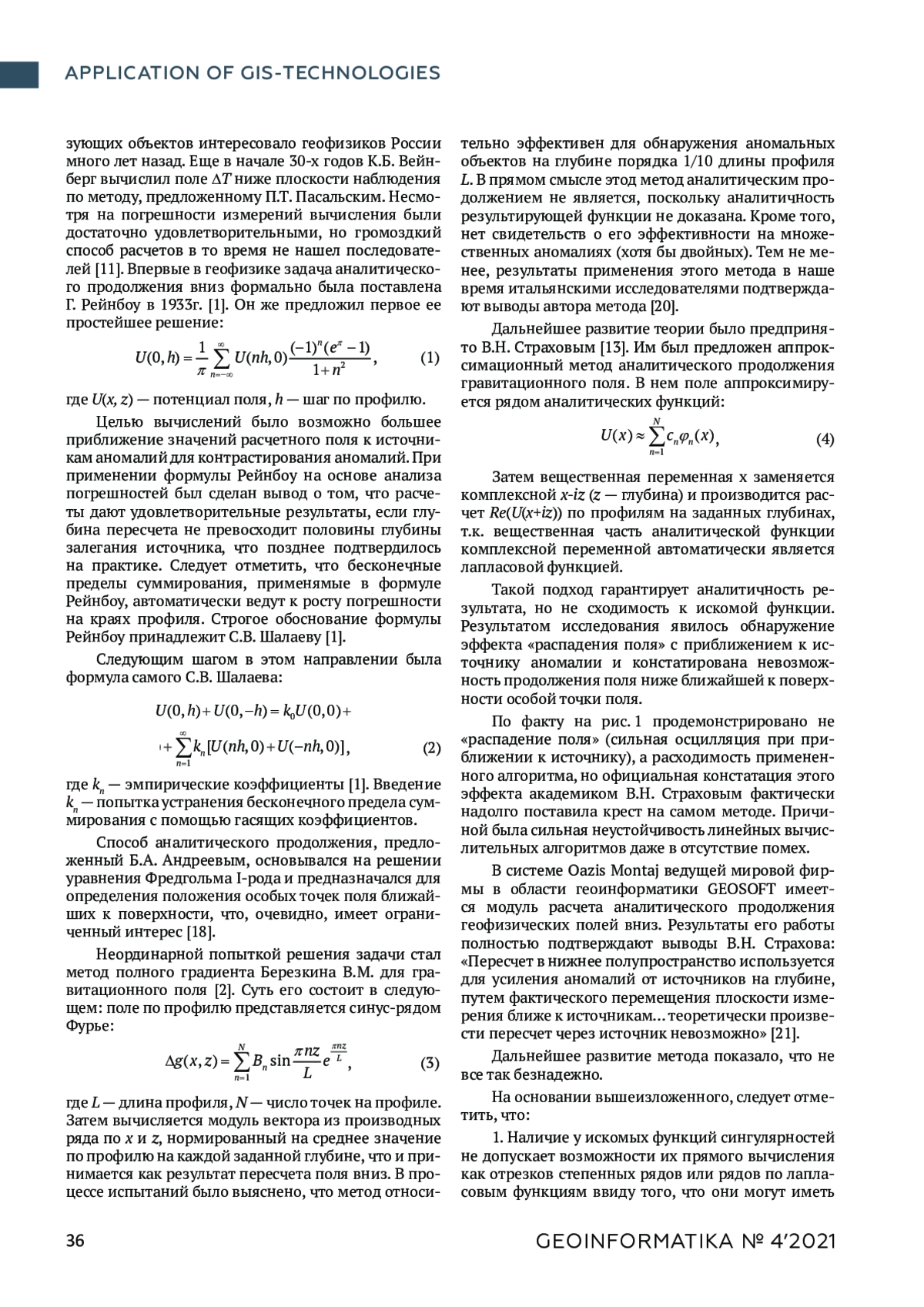 Аналитическое продолжение геофизических полей — один из важных инструментов интерпретации данных измерений как завершающей стадии геоинформационных построений и представляет собой эффективный вариант решения обратной задачи. В отличие от различных методов трансформаций полей, базирующихся на интуитивных соображениях, имеющих целью подчеркнуть какиелибо их особенности, аналитическое продолжение основывается на строгой математической базе и позволяет вычислять значения поля в точках пространства выше и ниже уровня измерений.