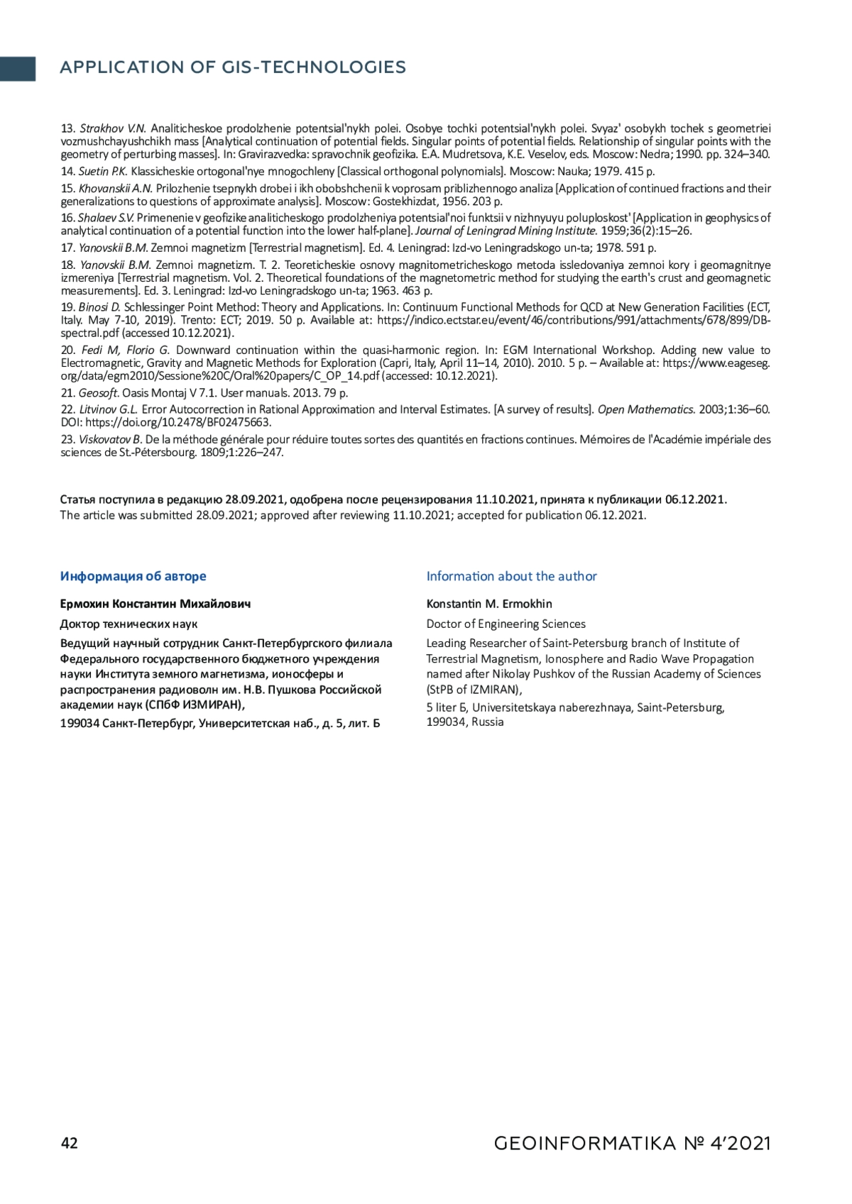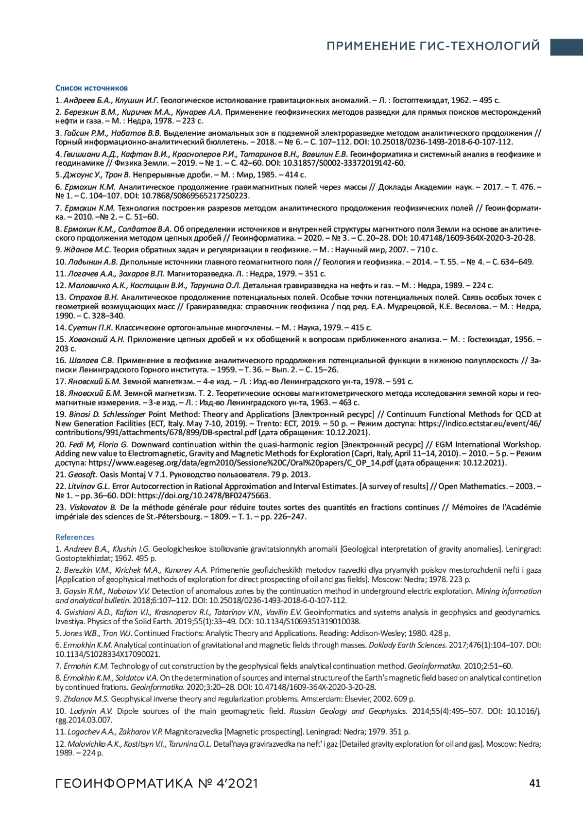 7. Ермохин К.М. Технология построения разрезов методом аналитического продолжения геофизических полей // Геоинформатика. - 2010. -№ 2. - С. 51-60.