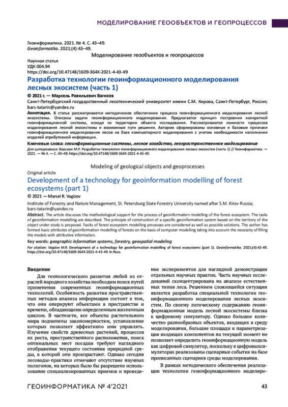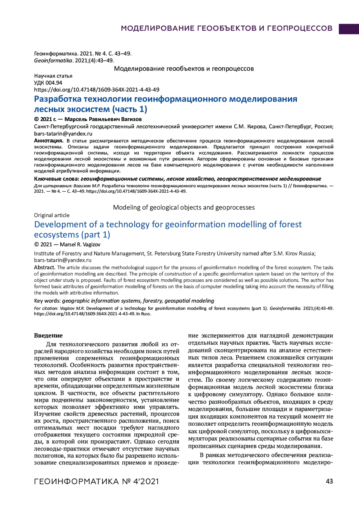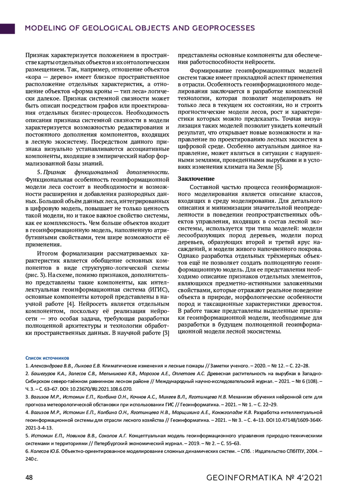 4. Вагизов М.Р., Истомин Е.П., Колбина О.Н., Яготинцева Н.В., Морщихина А.Е., Конжголадзе К.В. Разработка интеллектуальной геоинформационной системы для отрасли лесного хозяйства // Геоинформатика. - 2021. - № 3. - С. 4-13. DOI: 10.47148/1609-364X-2021-3-4-13