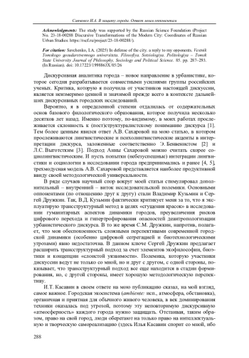 В статье даны ответы на замечания и ремарки, высказанные в ходе обсуждения моей статьи «Дискурсивная урбанистика: поиск метода». Показано, каким образом мои критики расширяют методологическое поле современных городских исследований. Получает развитие идея И. Т. Касавина (он вошел в число моих оппонентов) о необходимости защиты традиционной городской экосферы, аутентичной мироощущению живого чувствующего человека.