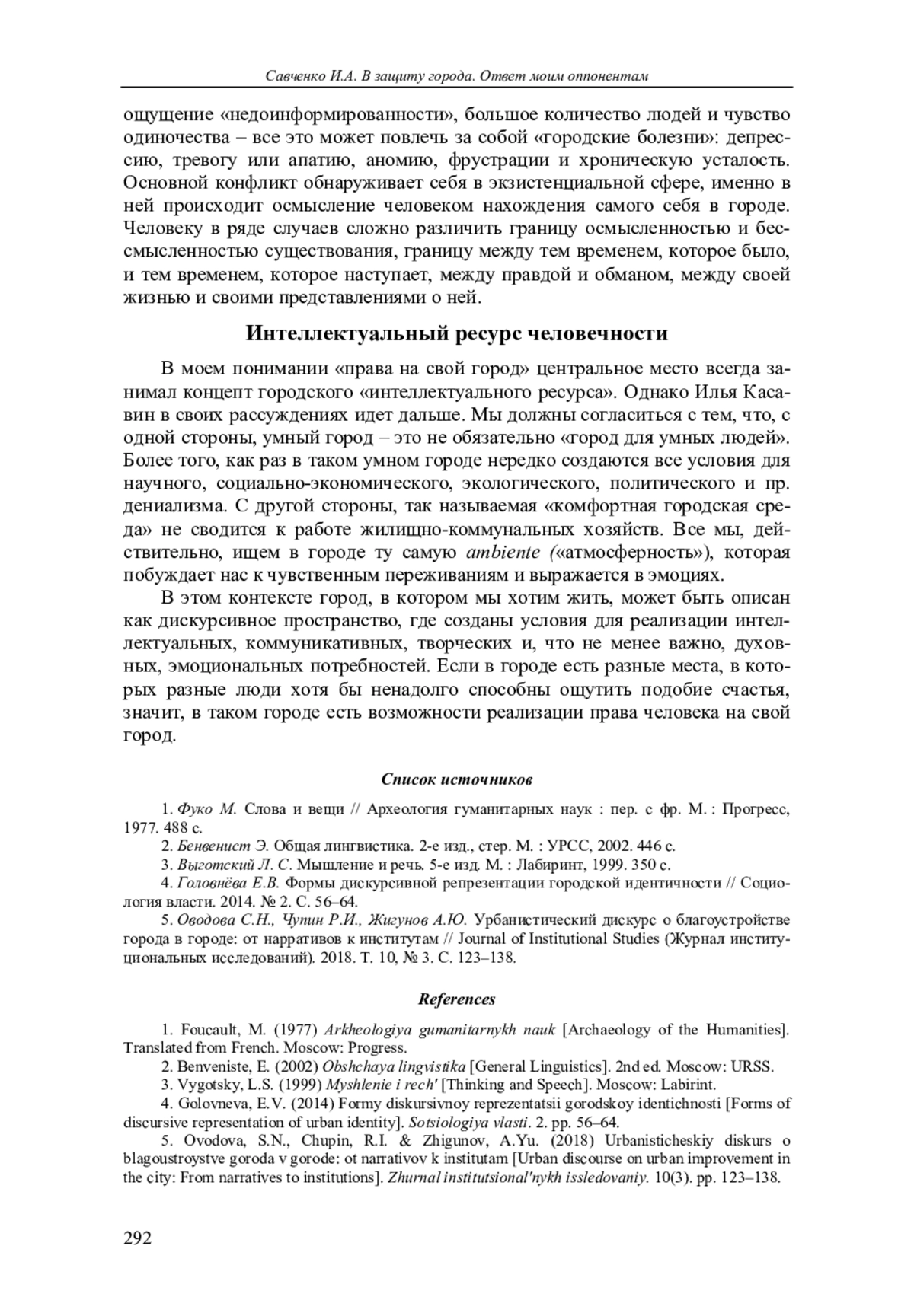 5. Оводова С.Н., Чупин Р.И., Жигунов А.Ю. Урбанистический дискурс о благоустройстве города в городе: от нарративов к институтам // Journal of Institutional Studies (Журнал институциональных исследований). 2018. Т. 10, № 3. С. 123-138.