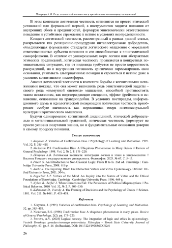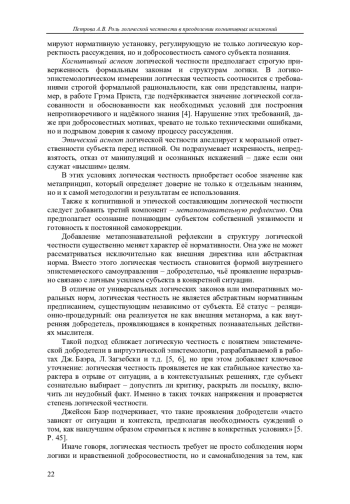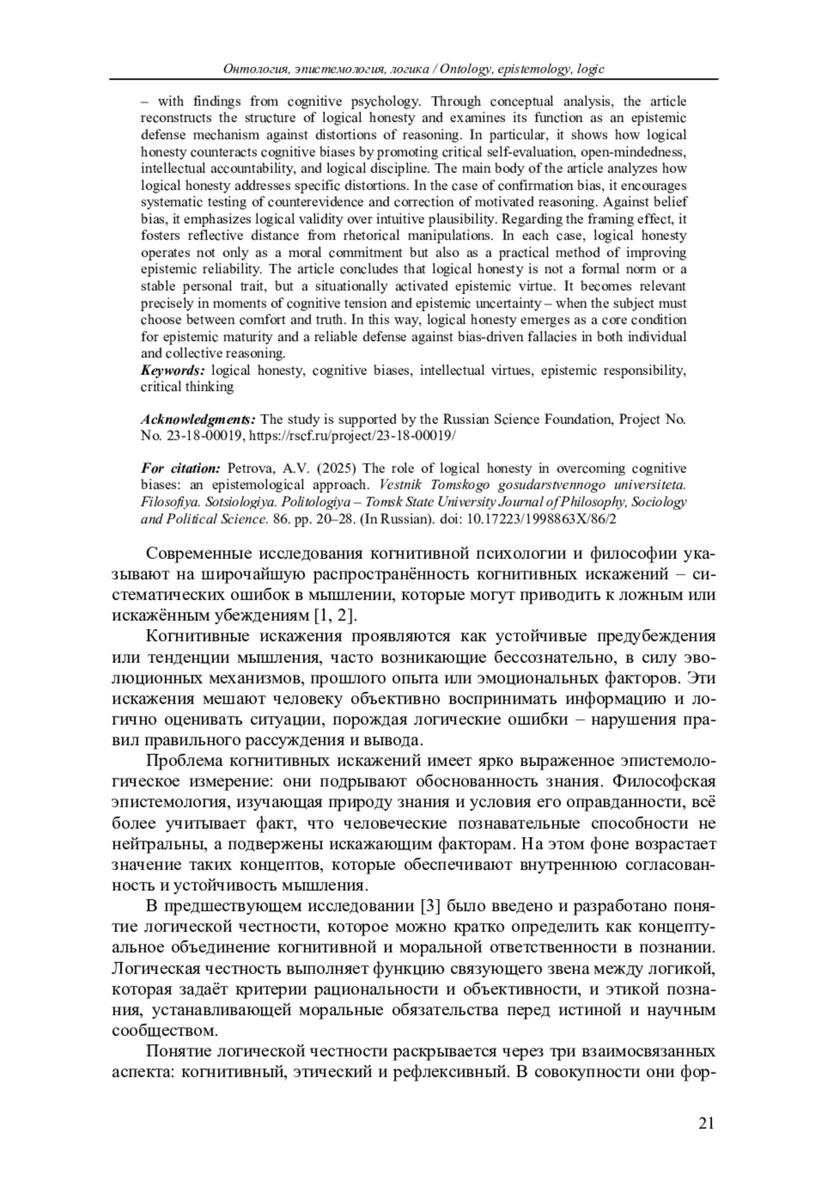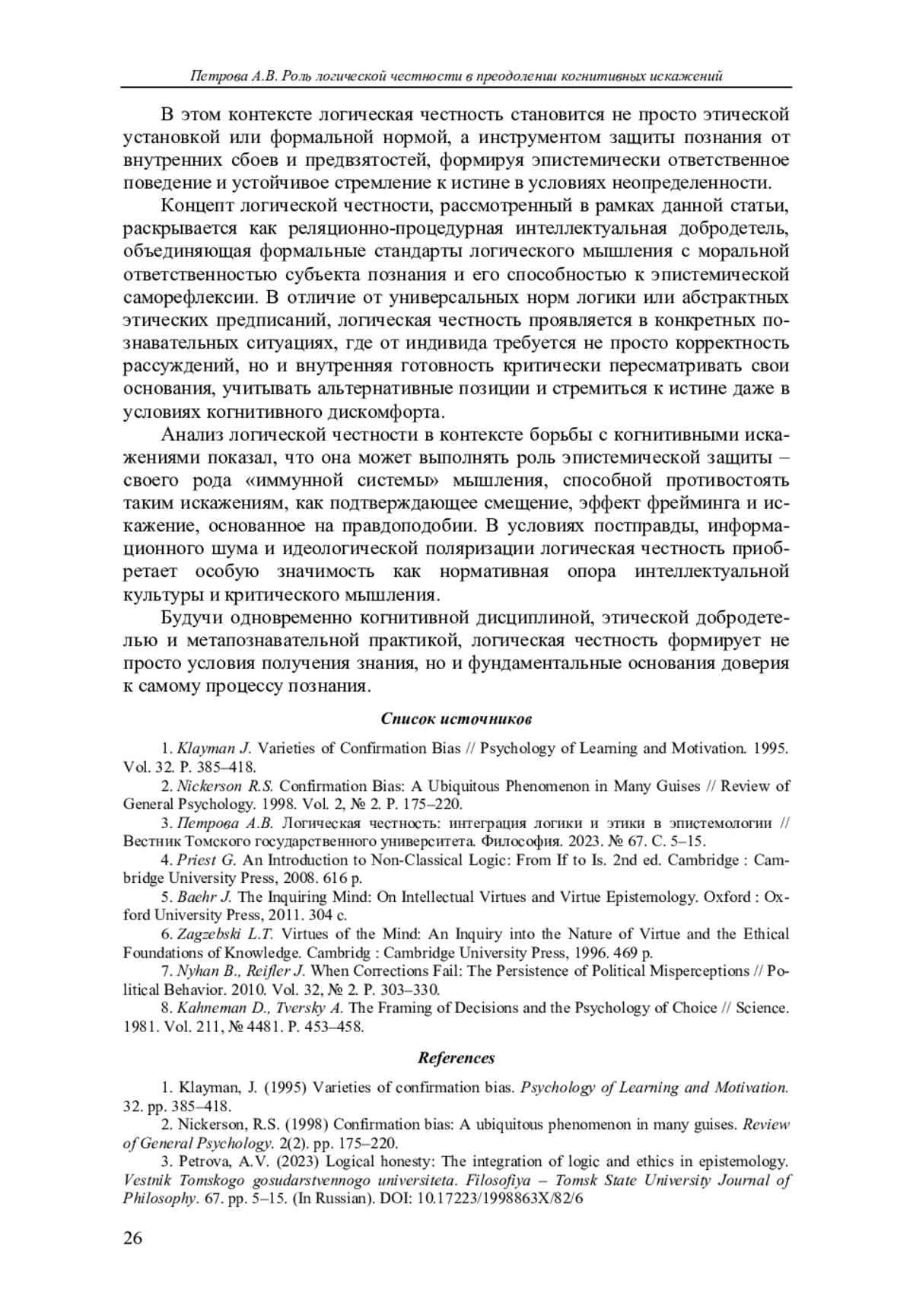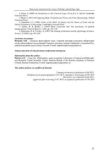 3. Петрова А.В. Логическая честность: интеграция логики и этики в эпистемологии // Вестник Томского государственного университета. Философия. 2023. № 67. С. 5-15.