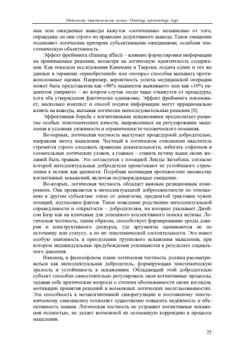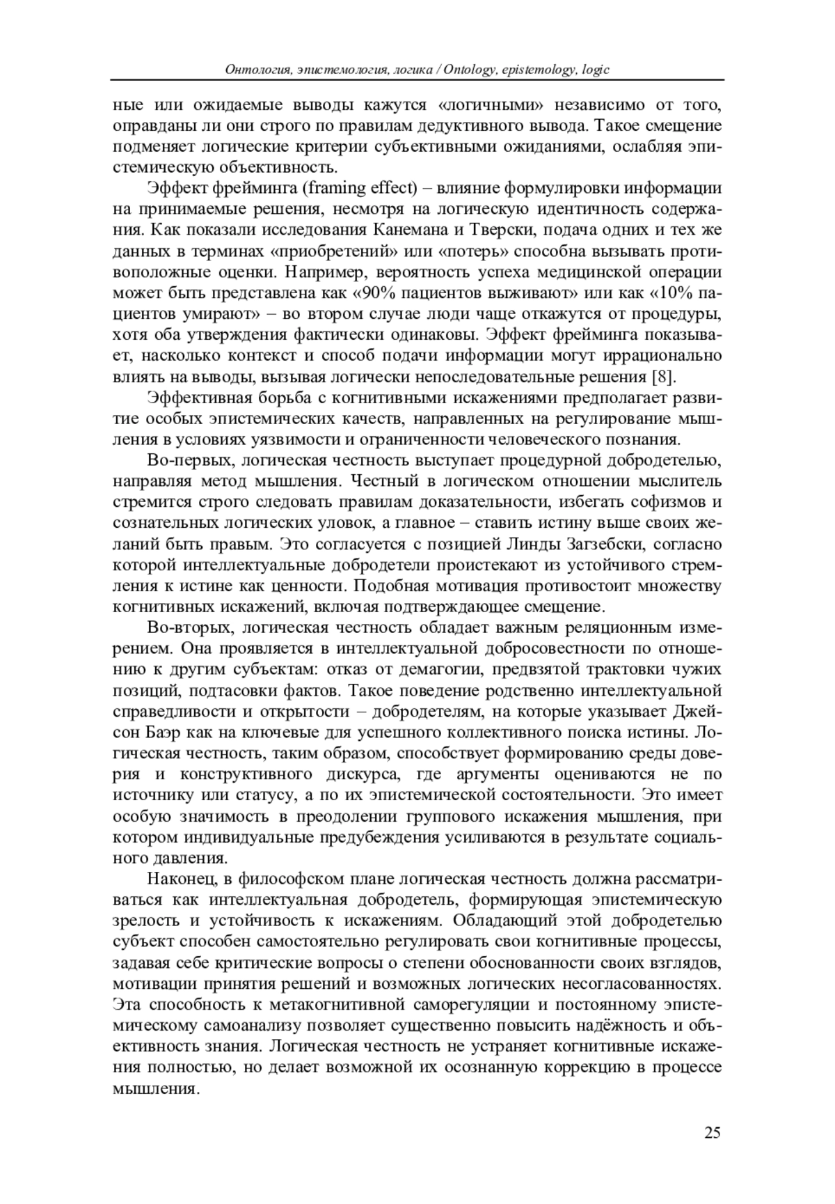 Анализируется концепт логической честности как реляционнопроцедурной эпистемической добродетели, сочетающей когнитивную строгость, моральную ответственность и метапознавательную рефлексию. Показано, как логическая честность способствует преодолению когнитивных искажений - подтверждающего смещения, эффекта фрейминга и искажения, основанного на правдоподобии, - и усиливает эпистемическую устойчивость мышления.
