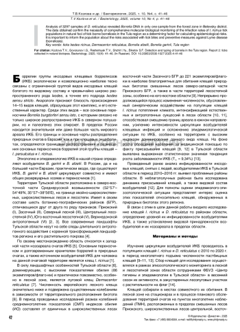 Rudakova SA, Teslova OE, Mutalinova NE, Kuzmenko YuF, Strek SV, Penyevskaya NA, et al. Molecular genetic surveillance based on the identification of borrelia in ixodid ticks. Fundamental and Clinical Medicine. 2023;8(1):63-70. (In Russian). DOI: 10.23946/25000764-2023-8-1-63-70