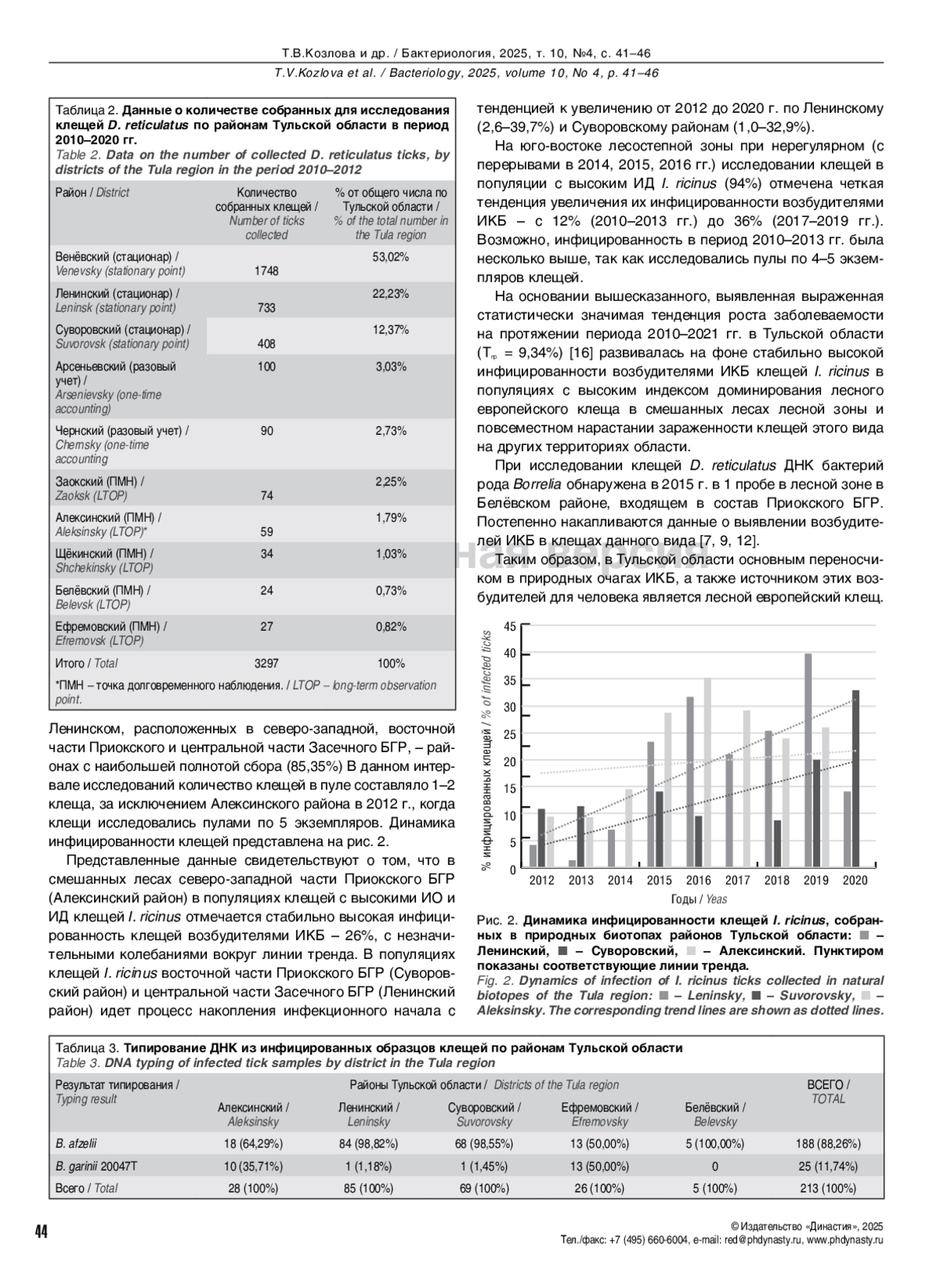Korotkov YuS, Kozlova TV. Dinamika chislennosti kleshcha Dermacentor reticulatus (Acari: Ixodidae) v lesolugovykh statsiyakh Tul’skoi oblasti. Voronezh, 2015;137-41. (In Russian).
