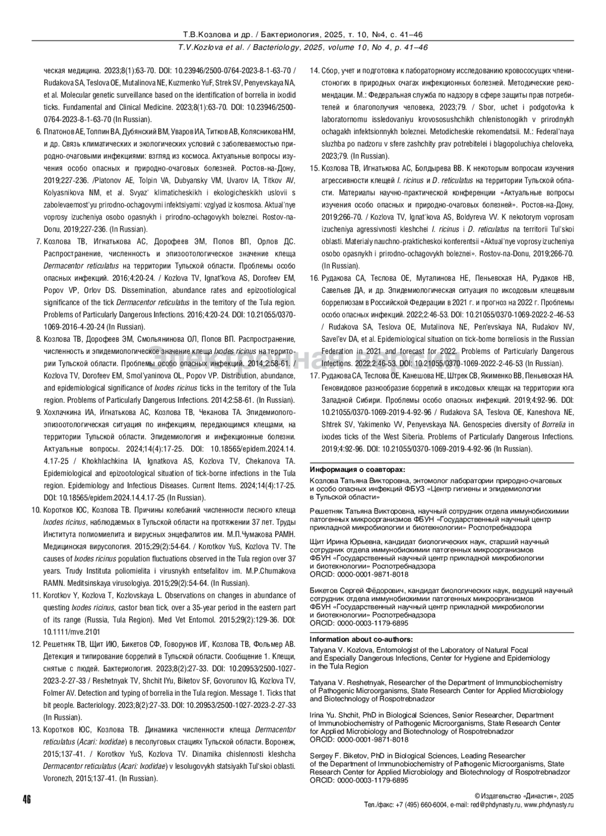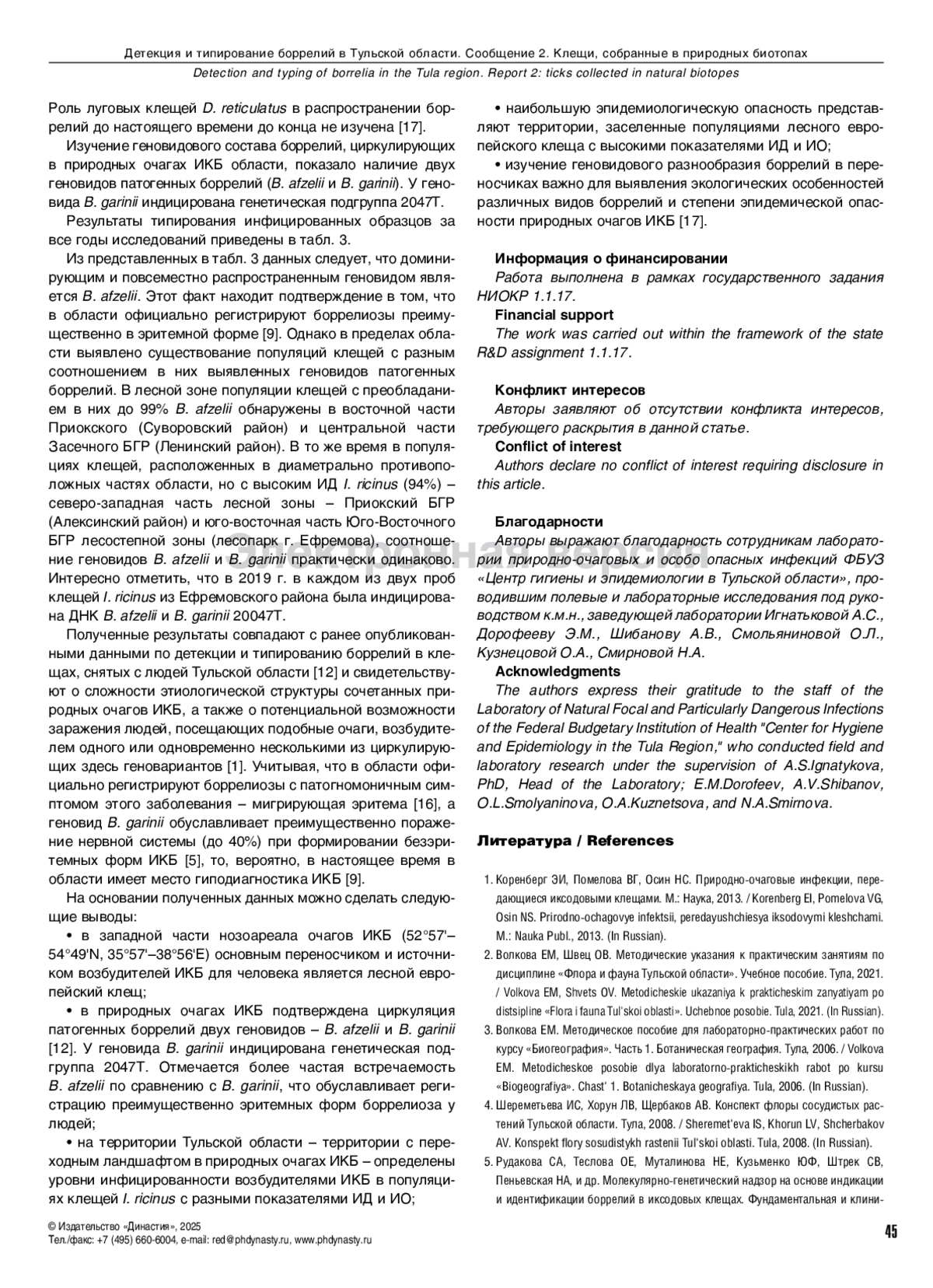 15. Козлова ТВ, Игнатькова АС, Болдырева ВВ. К некоторым вопросам изучения агрессивности клещей I. ricinus и D. reticulatus на территории Тульской области. Материалы научно-практической конференции “Актуальные вопросы изучения особо опасных и природно-очаговых болезней”. Ростов-на-Дону, 2019;266-70.