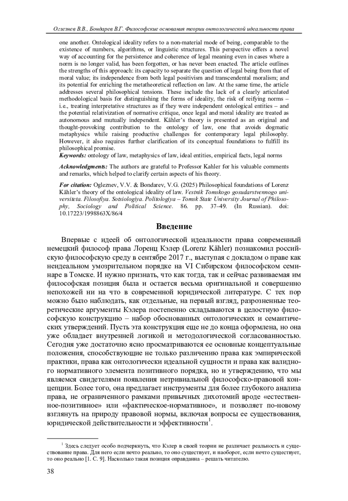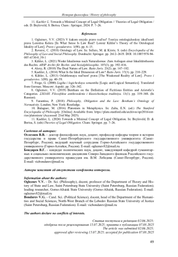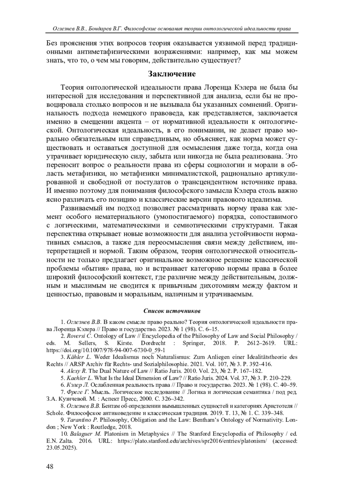 1. Оглезнев В.В. В каком смысле право реально? Теория онтологической идеальности права Лоренца Кэлера // Право и государство. 2023. № 1 (98). С. 6-15. EDN: NBTJBX