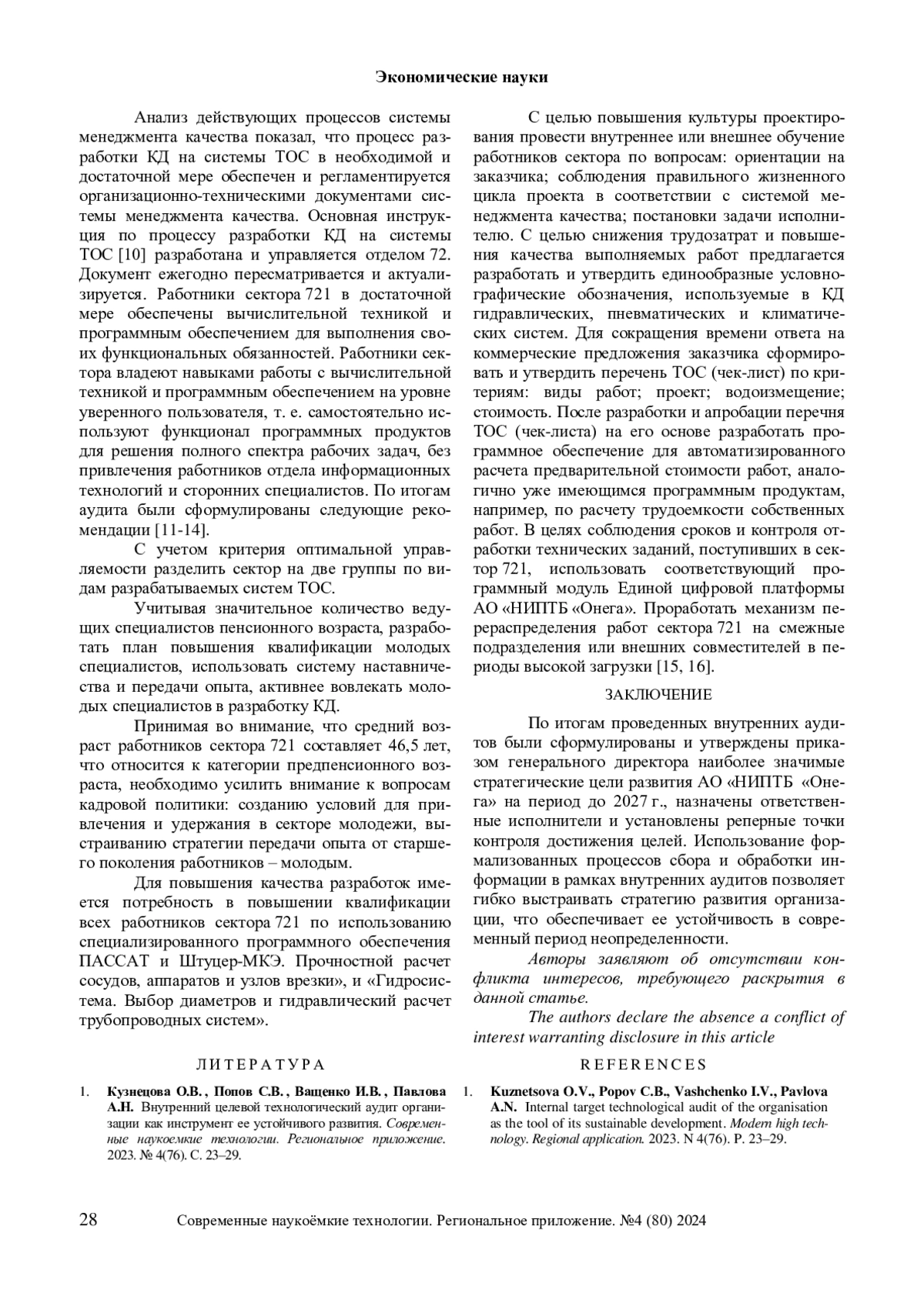 1. Кузнецова О.В., Попов С.В., Ващенко И.В., Павлова А.Н. Внутренний целевой технологический аудит организации как инструмент ее устойчивого развития. Современные наукоемкие технологии. Региональное приложение. 2023. № 4(76). С. 23-29. EDN: JHXWAV