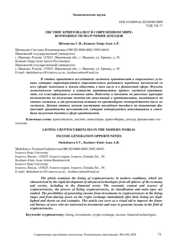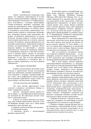 В статье проводится исследование листинга криптовалют в современных условиях, которые характеризуются стремительным развитием передовых технологий со всех сферах экономики и жизни общества, в том числе и в финансовой сфере. Изучены экономическое содержание и сущность криптовалюты, процесс листинга криптовалют, его классификация и основные виды. Выделены и показаны на реальных примерах возможности по получению доходов от инвестиций в криптовалюты, находящиеся на этапах листинга, и от размещения активов на криптобирже непосредственно после их листинга. Данная статья может выступать наглядным пособием по повышению финансовой грамотности пользователей, которые интересуются инвестициями и способами получения доходов в сфере криптовалют.