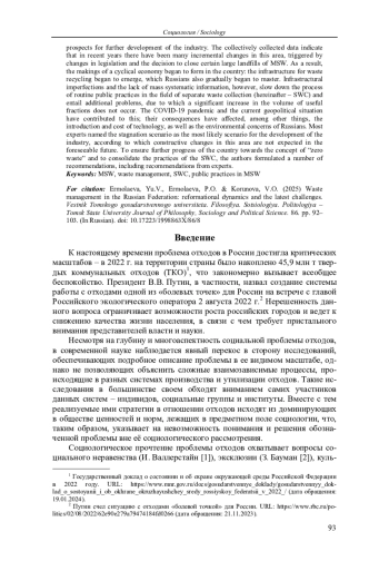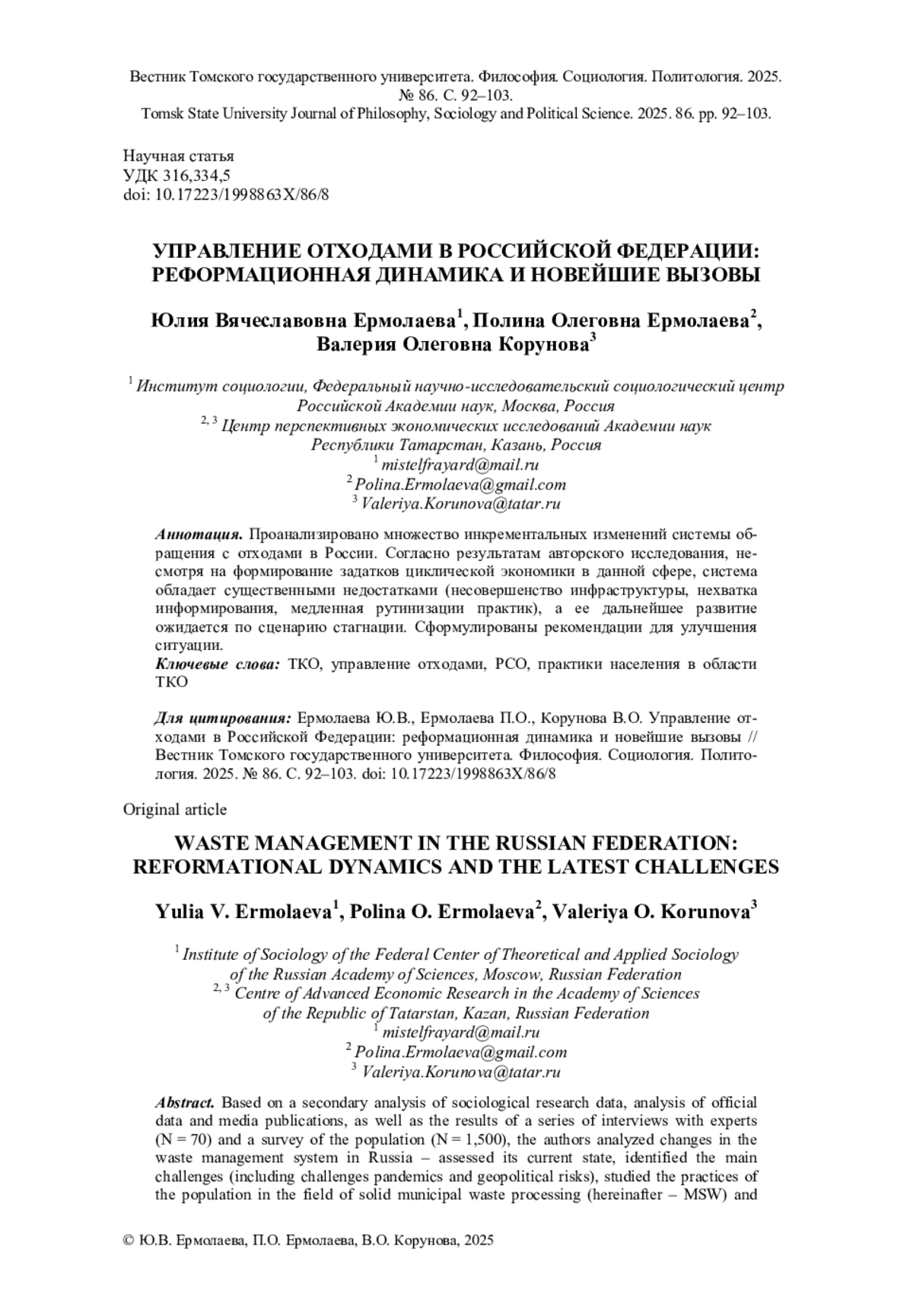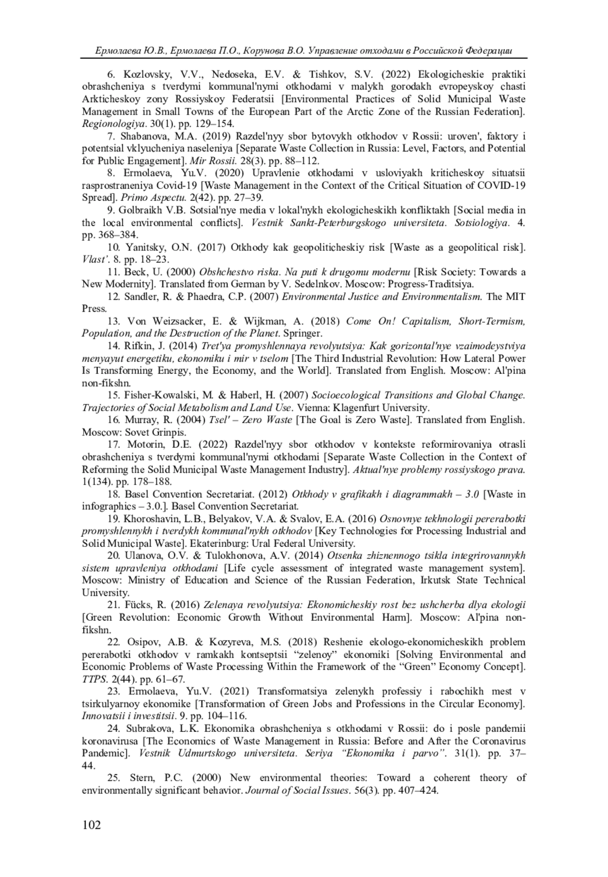 5. Ермолаева Ю.В. Модернизация сектора обращения с отходами в России: предложения экспертов и населения // Общество: социология, психология, педагогика. 2020. № 8 (76). С. 26-34. EDN: DNAXCO