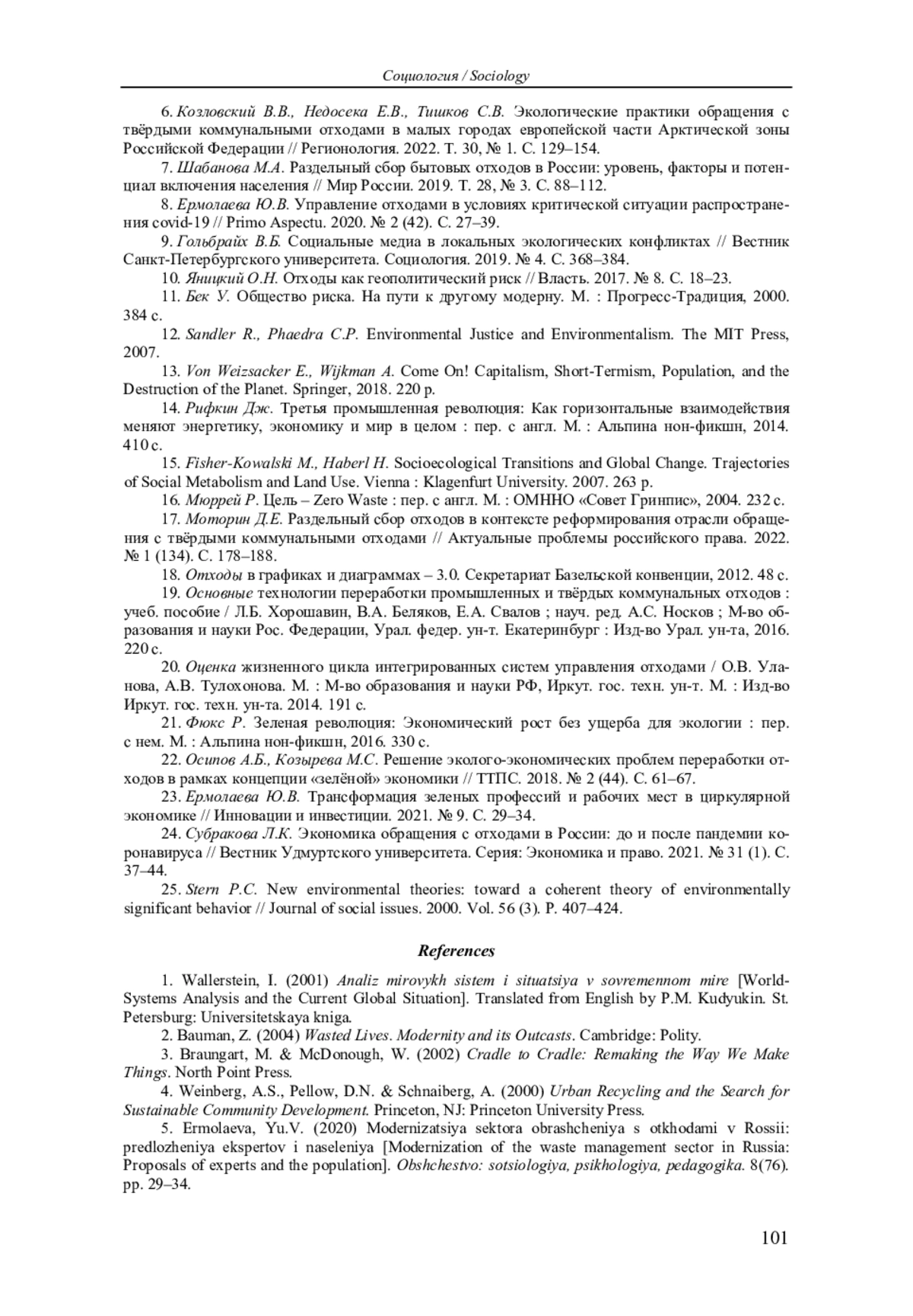 7. Шабанова М.А. Раздельный сбор бытовых отходов в России: уровень, факторы и потенциал включения населения // Мир России. 2019. Т. 28, № 3. С. 88-112. EDN: NMELLA