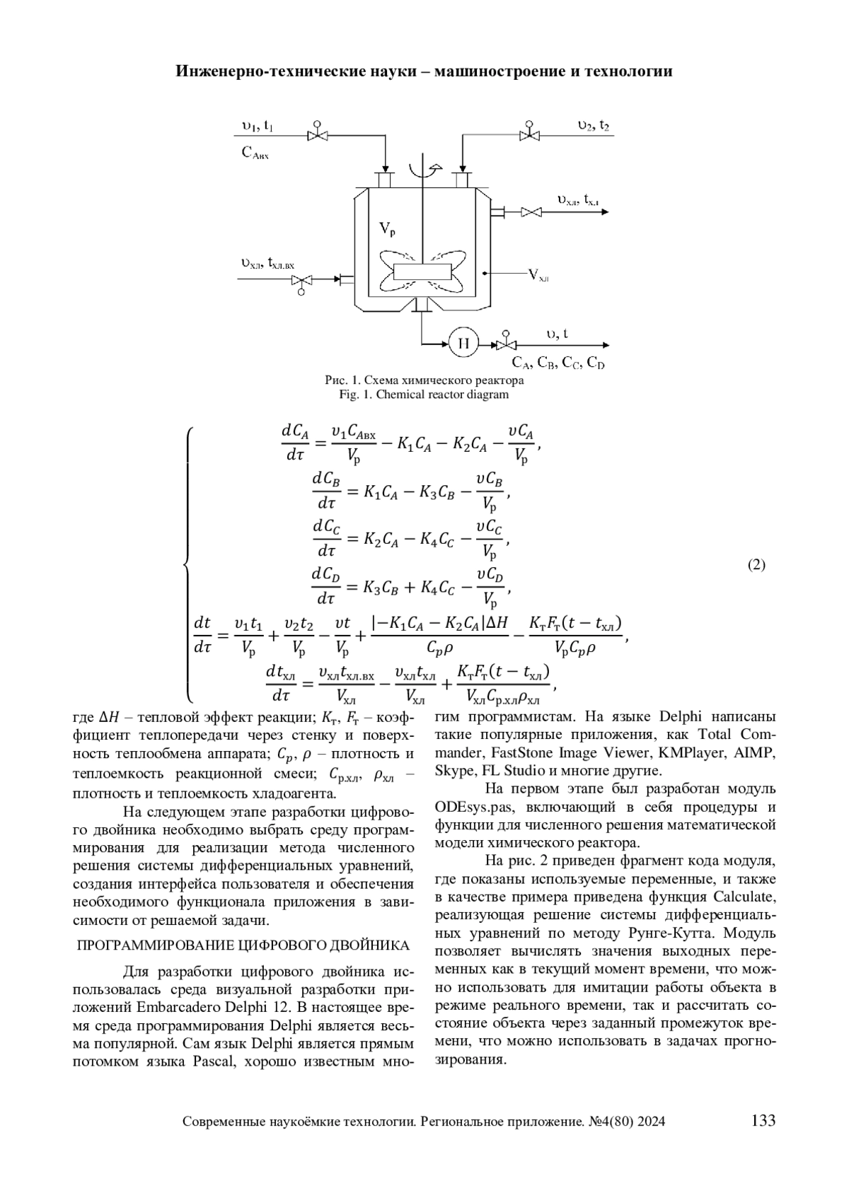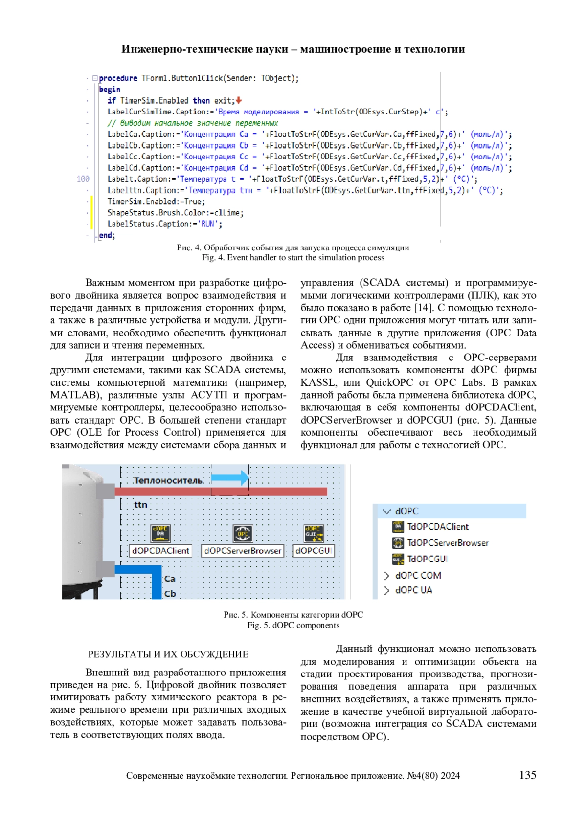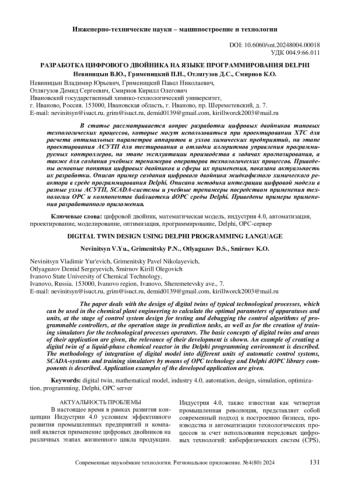 В статье рассматривается вопрос разработки цифровых двойников типовых технологических процессов, которые могут использоваться при проектировании ХТС для расчета оптимальных параметров аппаратов и узлов химических предприятий, на этапе проектирования АСУТП для тестирования и отладки алгоритмов управления программируемых контроллеров, на этапе эксплуатации производства в задачах прогнозирования, а также для создания учебных тренажеров операторов технологических процессов. Приведены основные понятия цифровых двойников и сферы их применения, показана актуальность их разработки. Описан пример создания цифрового двойника жидкофазного химического реактора в среде программирования Delphi. Описана методика интеграции цифровой модели в разные узлы АСУТП, SCADA-системы и учебные тренажеры посредством применения технологии OPC и компонентов библиотеки dOPC среды Delphi. Приведены примеры применения разработанного приложения.