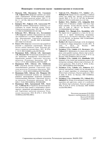 14. Невиницын В.Ю., Грименицкий П.Н., Лихач Д.С., Субботин П.А. Разработка автоматизированной системы сбора данных и оперативного диспетчерского управления ректификационной установкой. Современные наукоемкие технологии. Региональное приложение. 2024. № 2(78). С. 85-92. DOI: 10.6060/snt.20247802.00012 EDN: TXOZEU