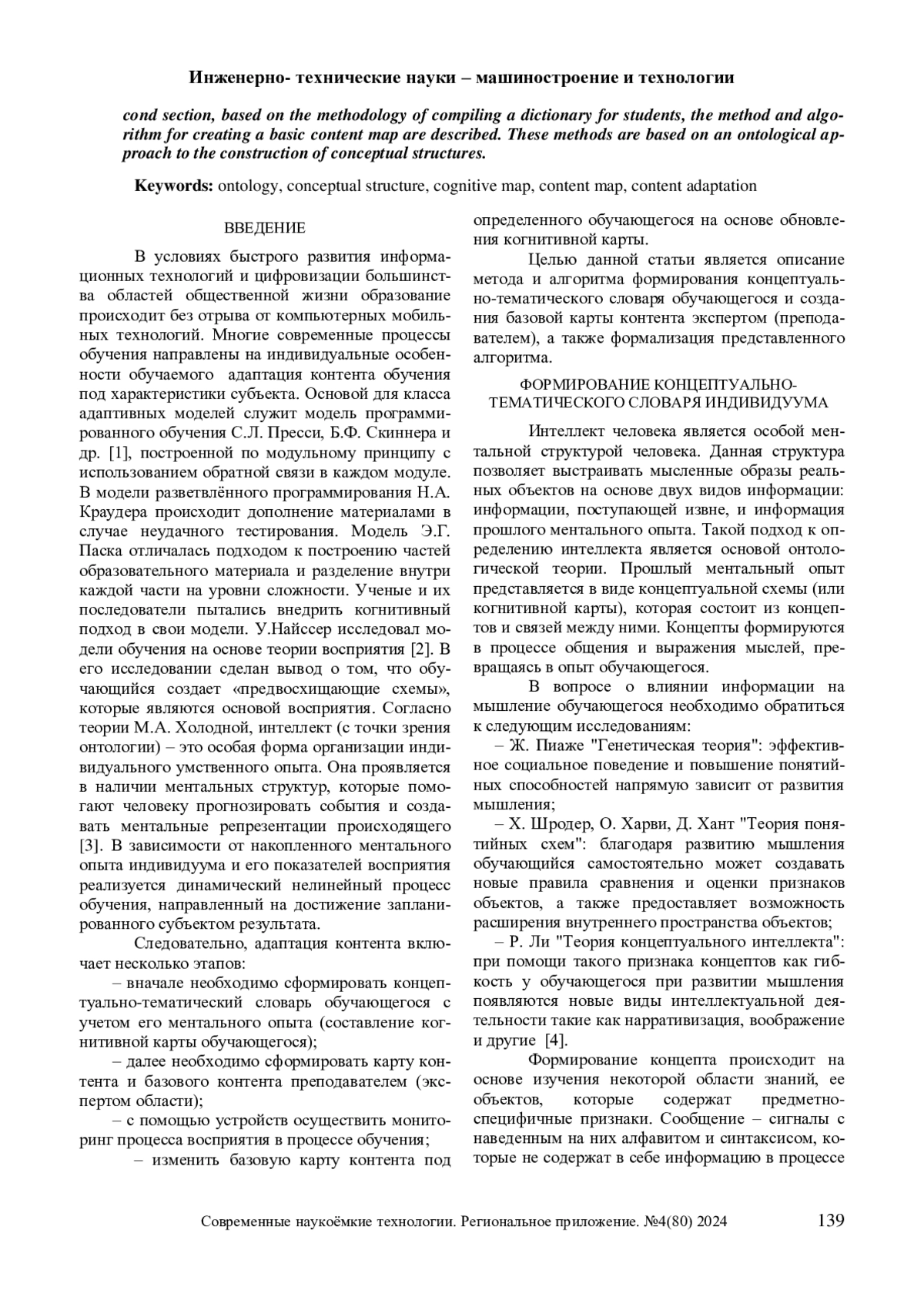 В контексте развития электронного учебного процесса разработка адаптируемых систем электронного обучения стала весьма важной областью деятельности. Существующий подход к адаптации, основанный исключительно на анализе деятельности обучающихся в рамках системы обучения, уже недостаточен, и началось активное изучение методов когнитивной адаптации. В данной статье представлен новый метод и алгоритм построения персонального тезауруса обучающегося и создания профессиональной карты контента экспертом в соответствующей предметной области (преподавателем). В соответствии с этими методами и алгоритмами проведено совершенствование программного приложения для адаптации электронного образовательного контента «Human Intelligent Reading (HIR)». О новизне и значимости этого подхода свидетельствует его ориентация на когнитивные характеристики каждого обучающегося, что позволяет создавать персонализированный контент в рамках продукта HIR для каждого отдельного обучающегося и позволяет вносить динамические коррективы. В первом разделе статьи представлены метод и алгоритм создания когнитивной карты обучающегося - понятийно-тематического словаря индивидуума. Во втором разделе на основе методологии составления словаря для обучающихся описываются метод и алгоритм создания базовой карты контента. Эти методы основаны на онтологическом подходе к построению концептуальных структур.