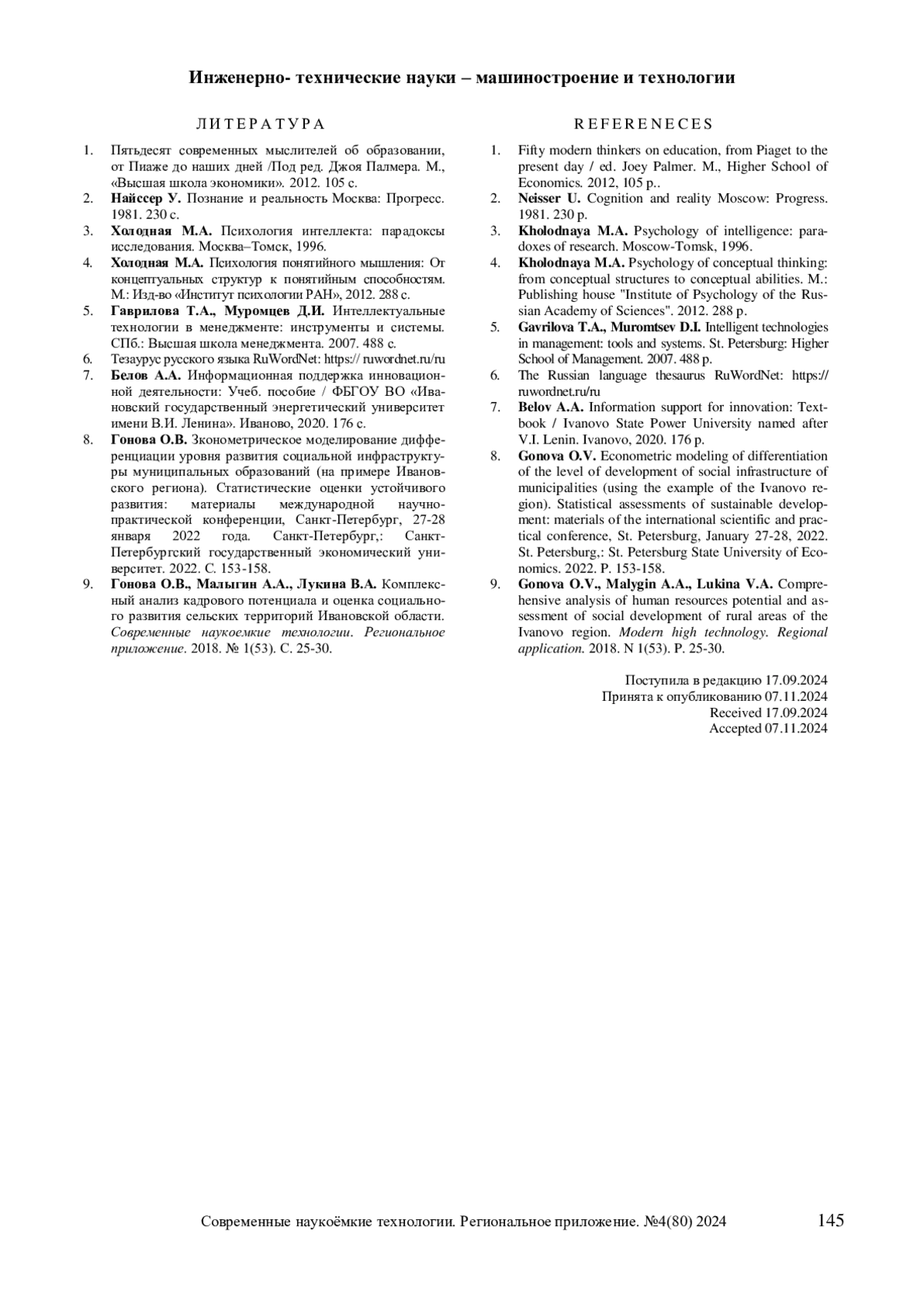9. Гонова О.В., Малыгин А.А., Лукина В.А. Комплексный анализ кадрового потенциала и оценка социального развития сельских территорий Ивановской области. Современные наукоемкие технологии. Региональное приложение. 2018. № 1(53). С. 25-30. EDN: YWXSDA