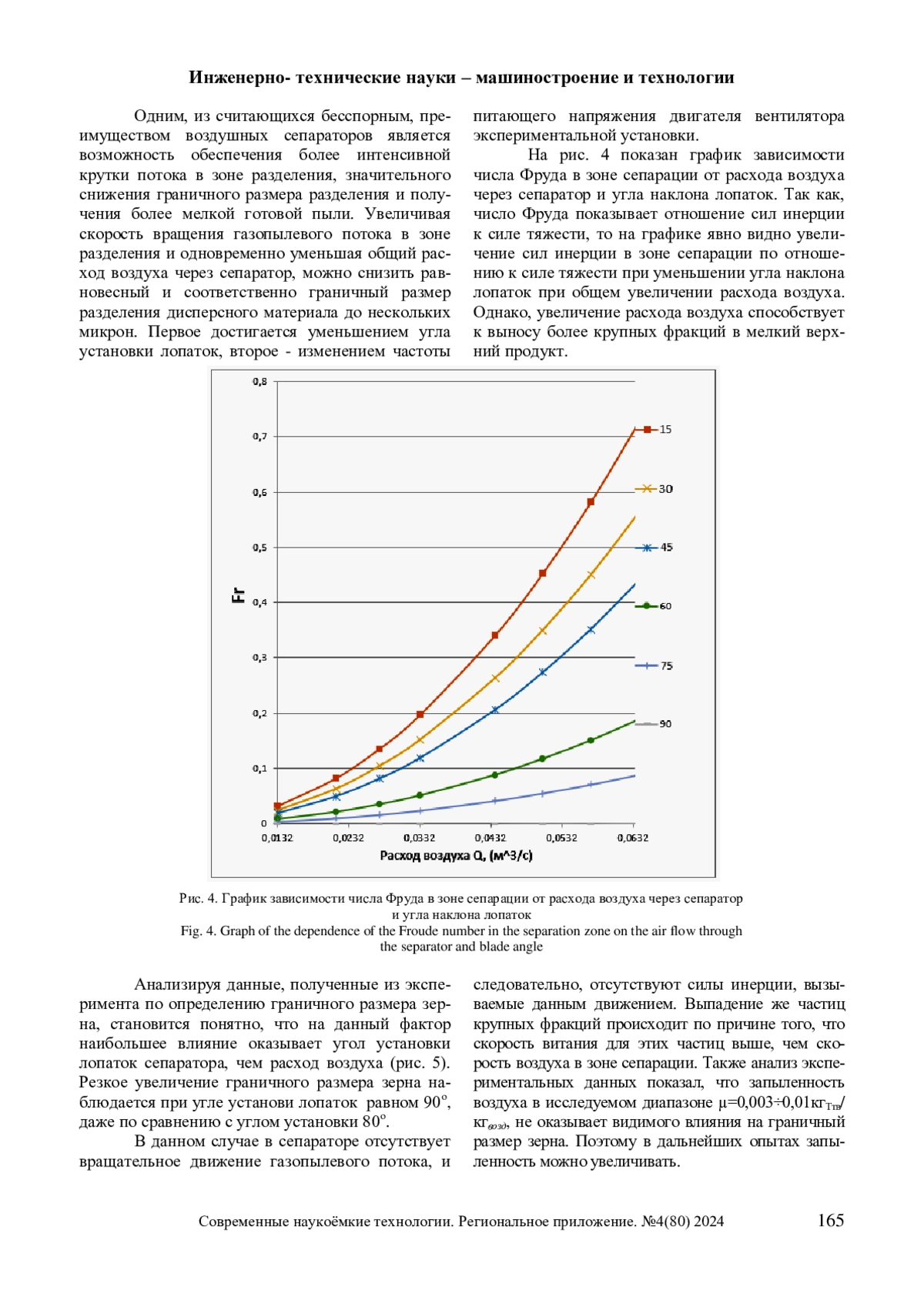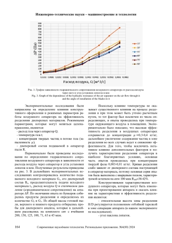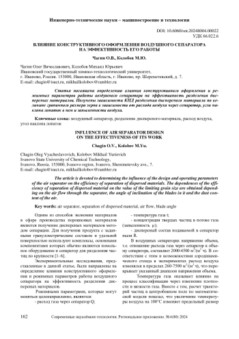 Статья посвящена определению влияния конструктивного оформления и режимных параметров работы воздушного сепаратора на эффективность разделения дисперсных материалов. Получены зависимости КПД разделения дисперсного материала по величине граничного размера зерна в зависимости от расхода воздуха через сепаратор, угла наклона лопаток в нем и запыленности воздуха.