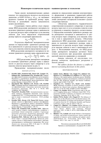 4. Колобов М.Ю., Козлов А.М., Чагин О.В. Влияние направляющих лопаток на эффективность процесса классификации. Надежность и долговечность машин и механизмов. Сборник материалов ХVВсероссийской научно-практической конференции. Иваново, 18 апреля 2024. С. 109-111. EDN: NAPVCQ