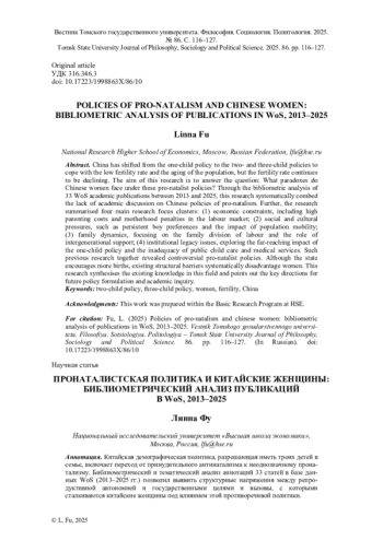 Китайская демографическая политика, разрешающая иметь троих детей в семье, включает переход от принудительного антинатализма к неоднозначному пронатализму. Библиометрический и тематический анализ аннотаций 33 статей в базе данных WoS (2013–2025 гг.) позволил выявить структурные напряжения между репродуктивной автономией и государственными целями и вызовы, с которыми сталкиваются китайские женщины под влиянием этой противоречивой политики.