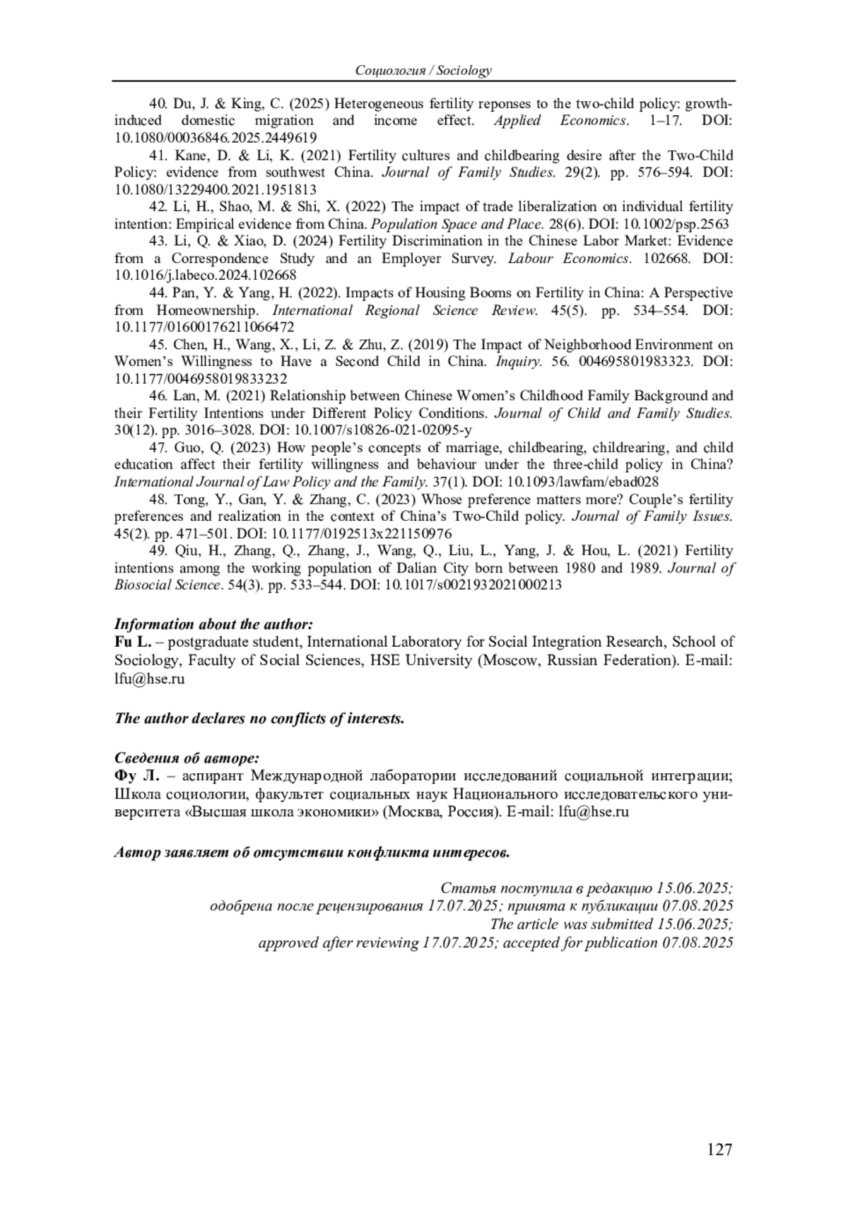 48. Tong, Y., Gan, Y. & Zhang, C. (2023) Whose preference matters more? Couple’s fertility preferences and realization in the context of China’s Two-Child policy. Journal of Family Issues. 45(2). pp. 471-501. DOI: 10.1177/0192513x221150976 EDN: CYJZRG